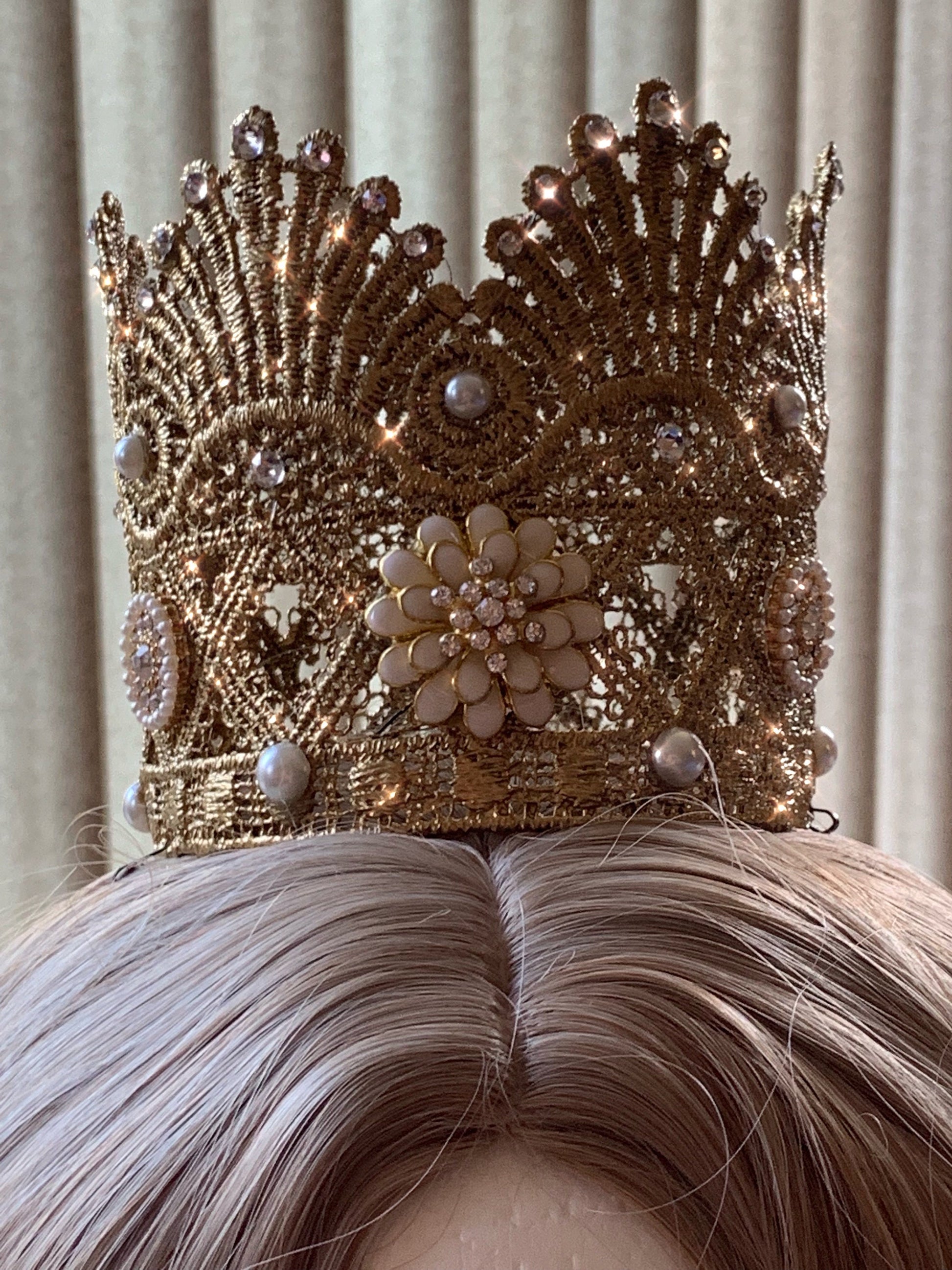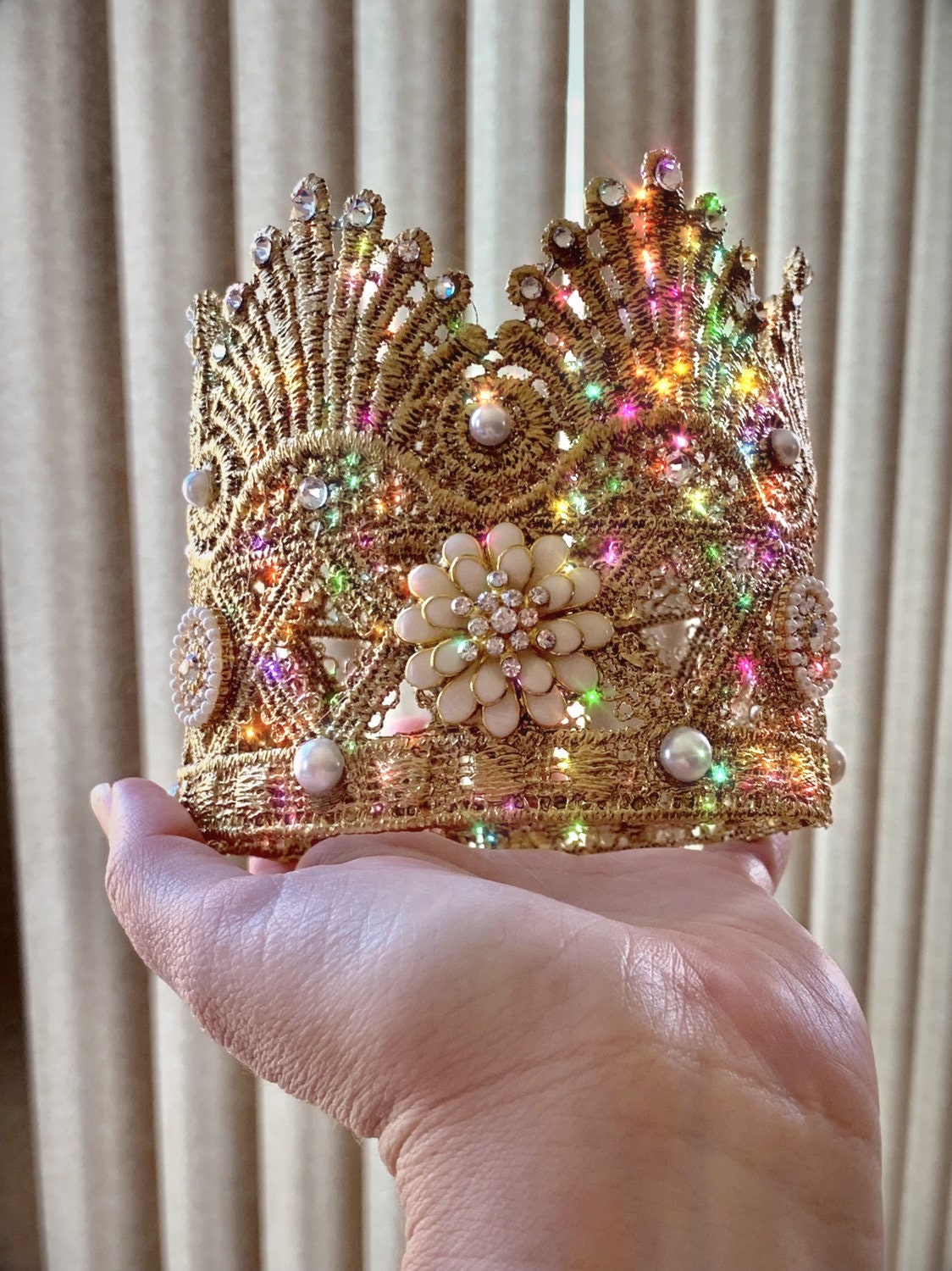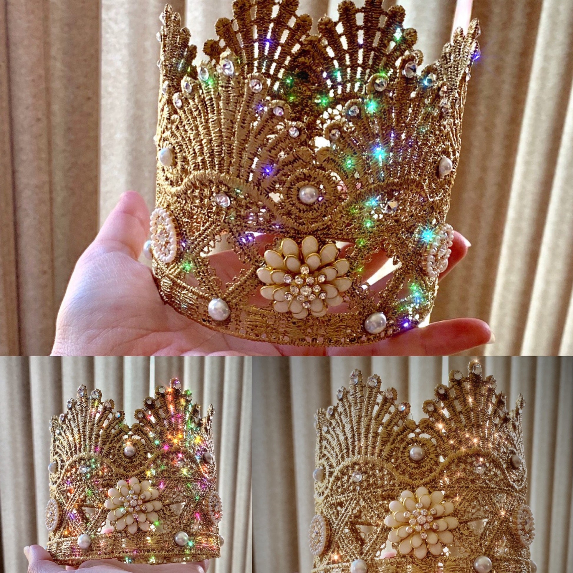 Small crown prefect for a party or costume or an event. This crow is about 3” diameter. it is made of harder lace. Can be made custom to for what ever costume of even you need. Just send me a message. I will happy to make something that fits your needs.