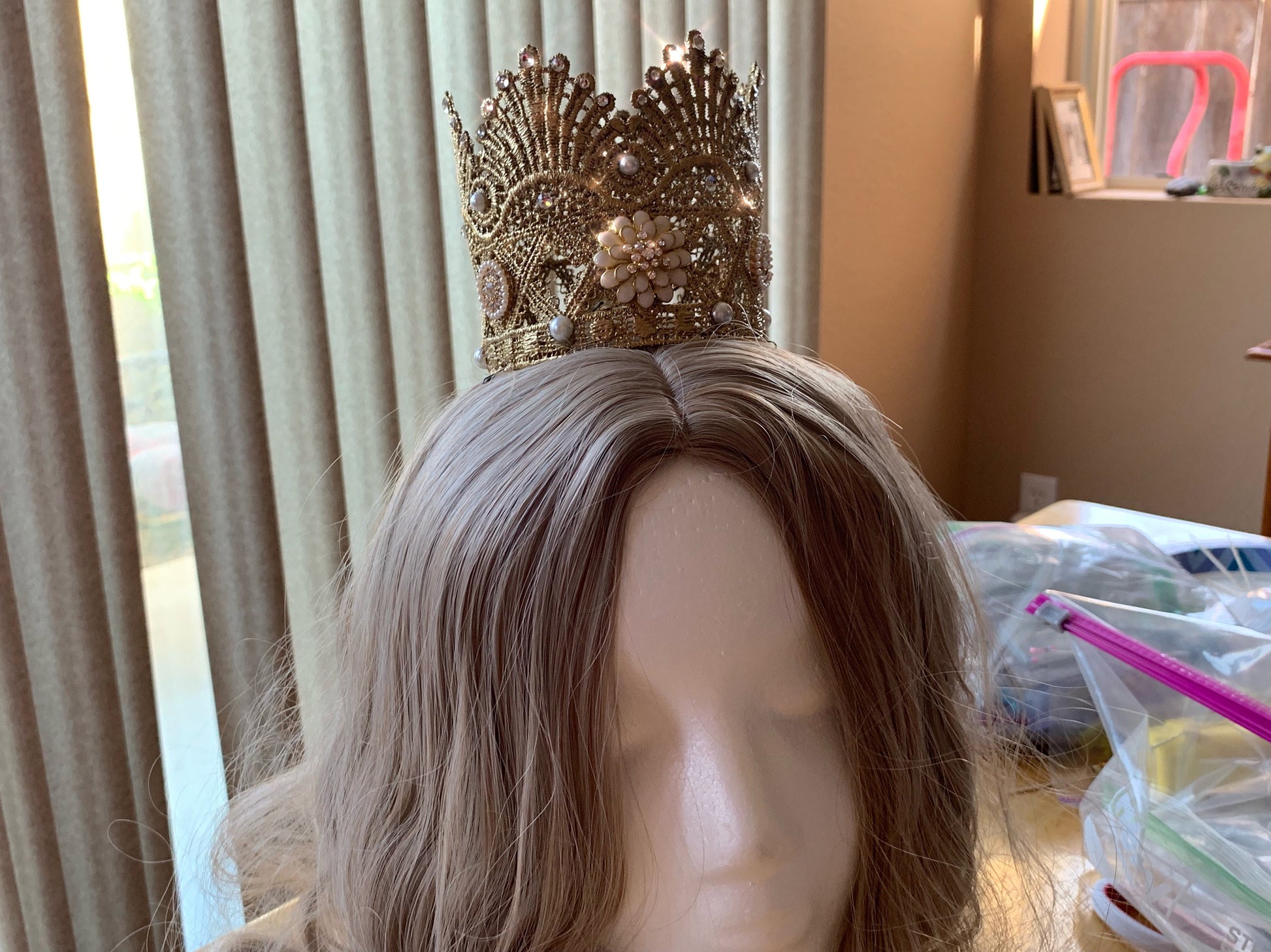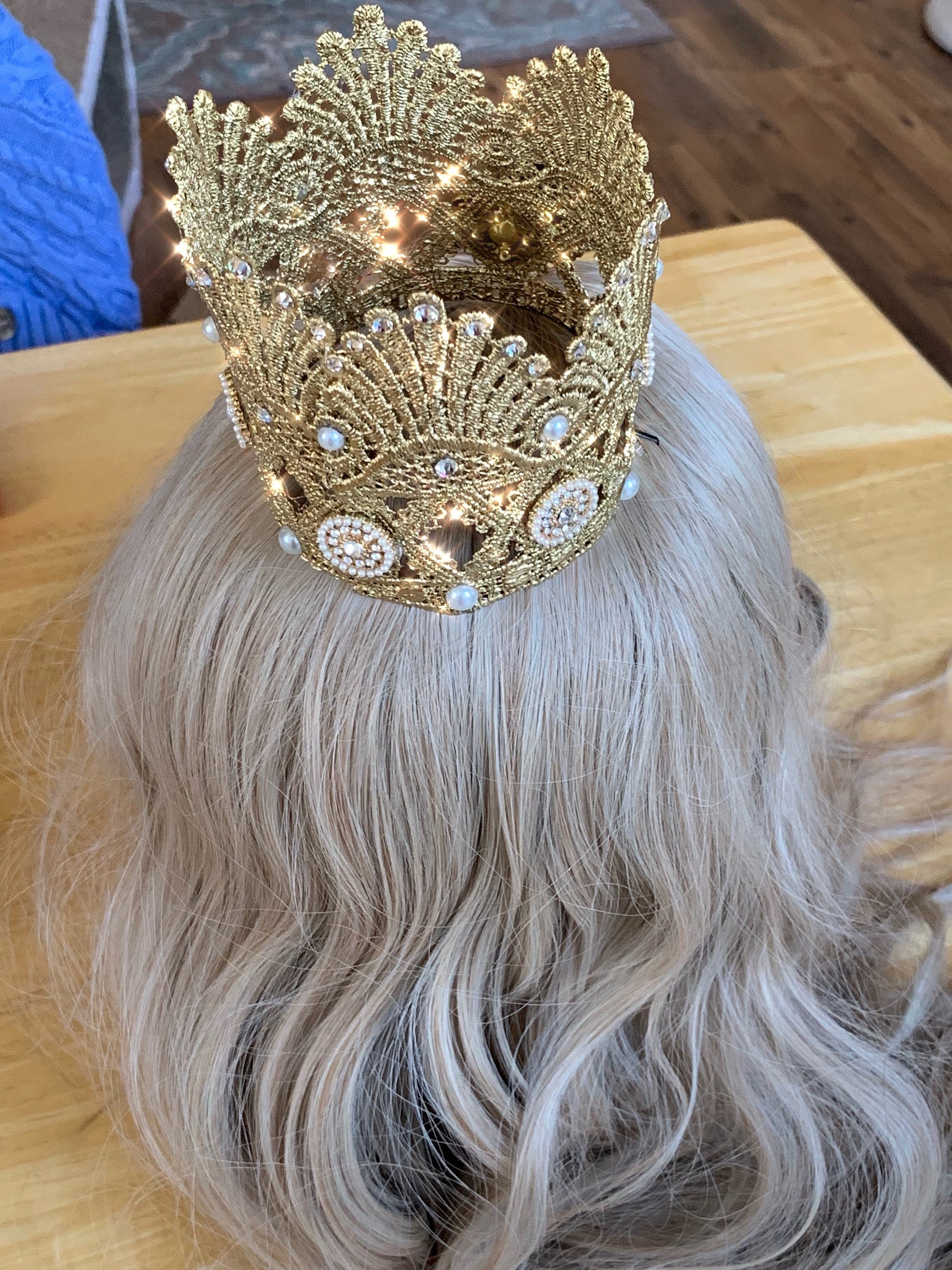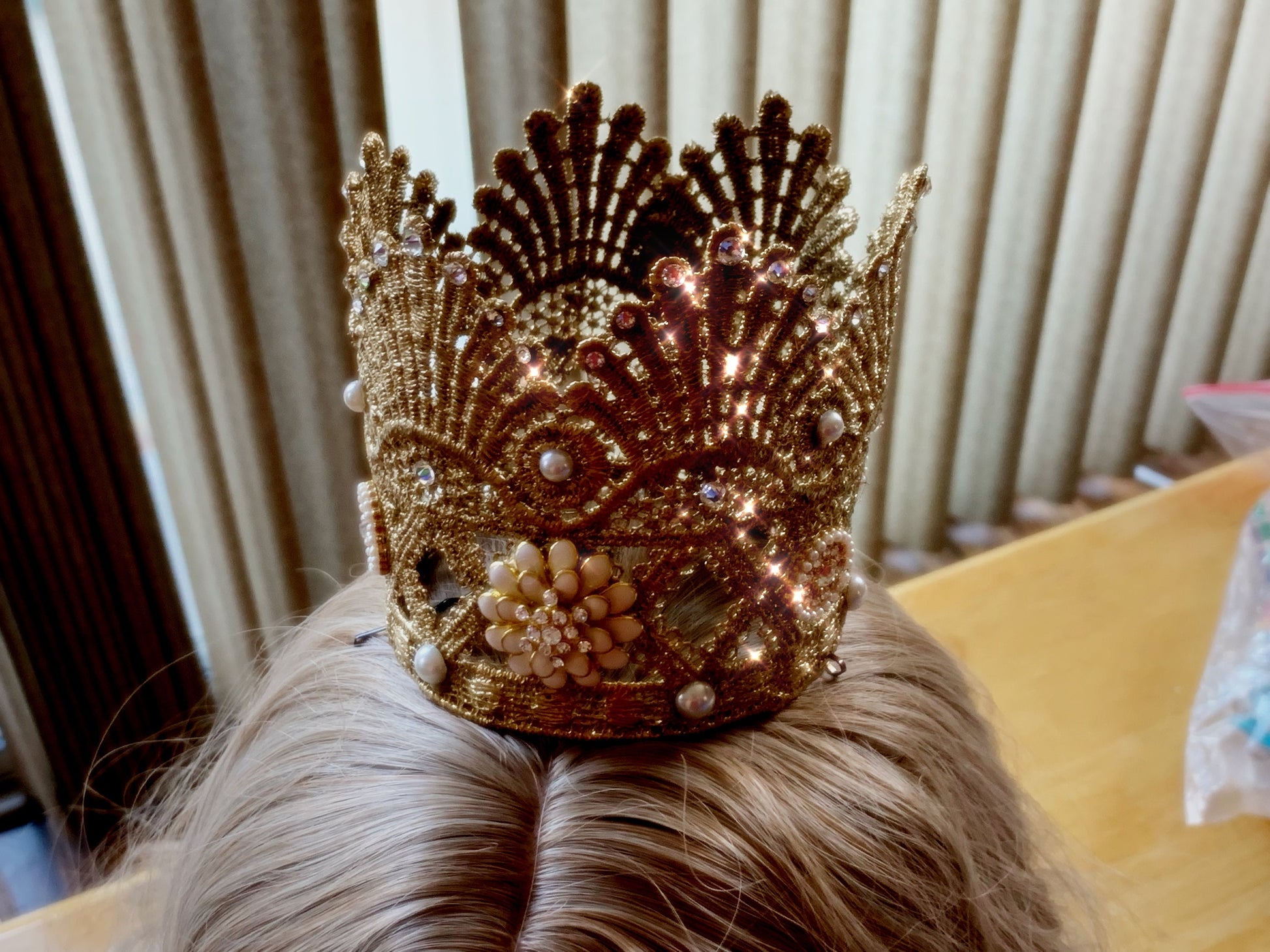 Small crown prefect for a party or costume or an event. This crow is about 3” diameter. it is made of harder lace. Can be made custom to for what ever costume of even you need. Just send me a message. I will happy to make something that fits your needs.