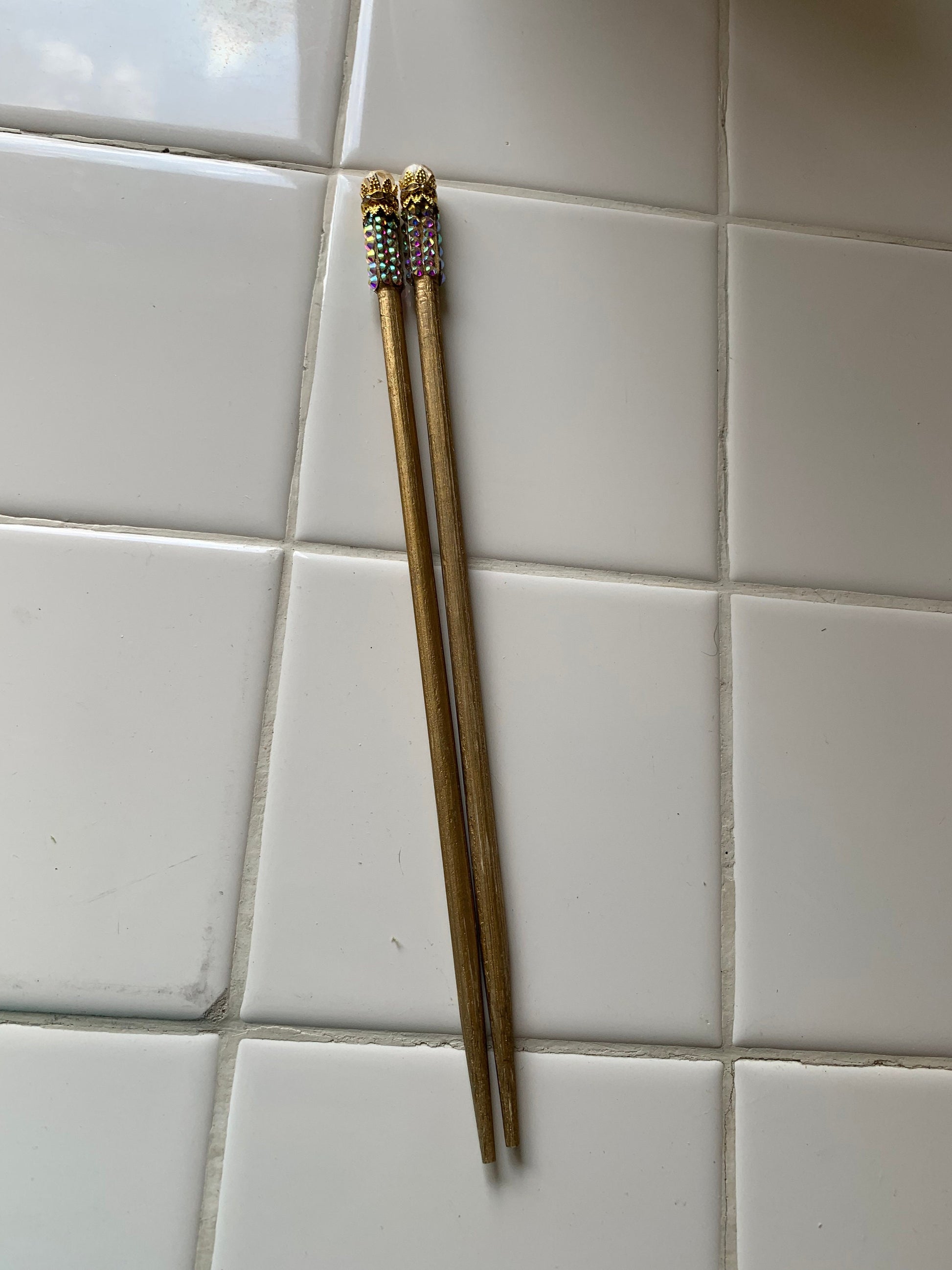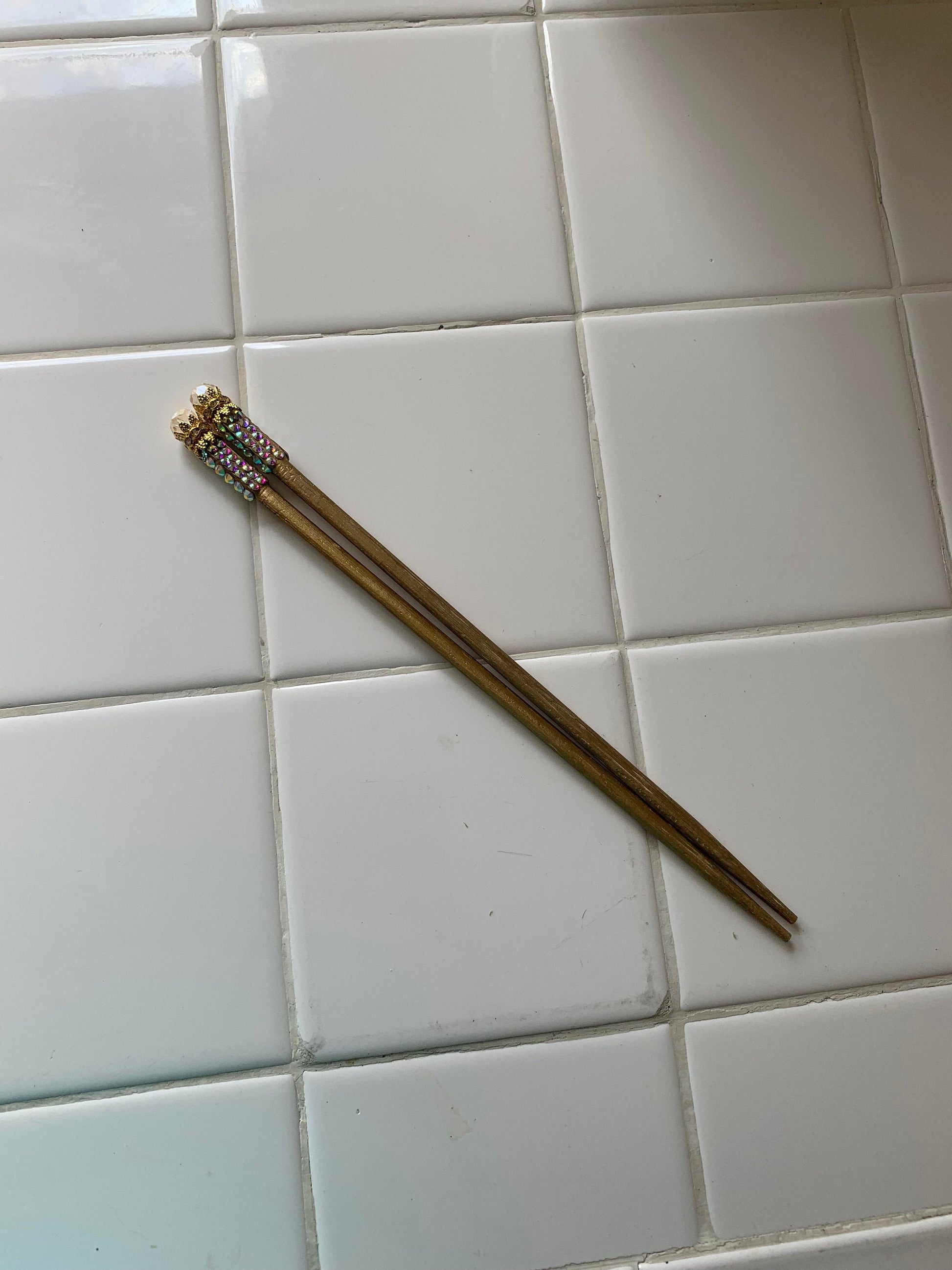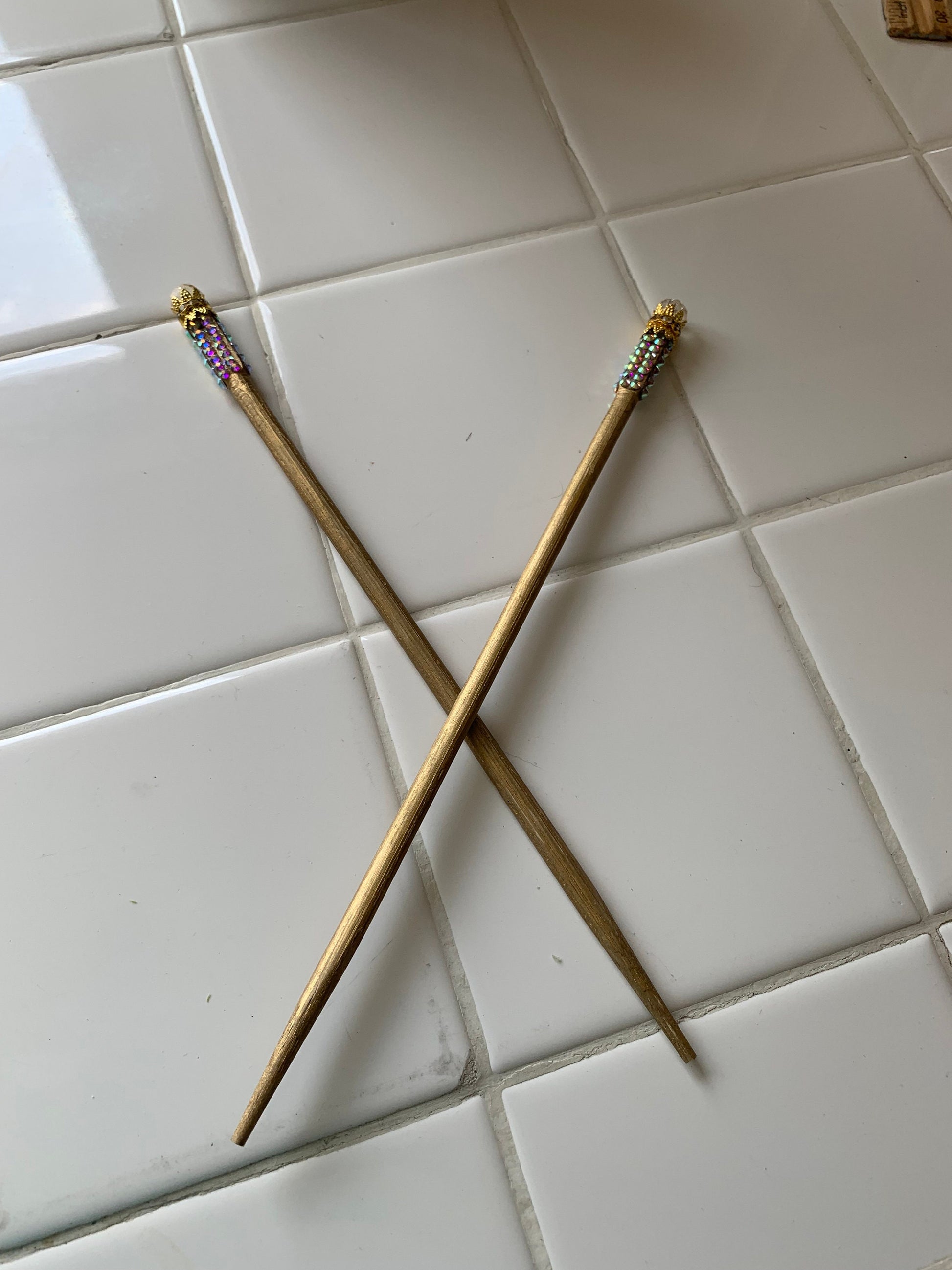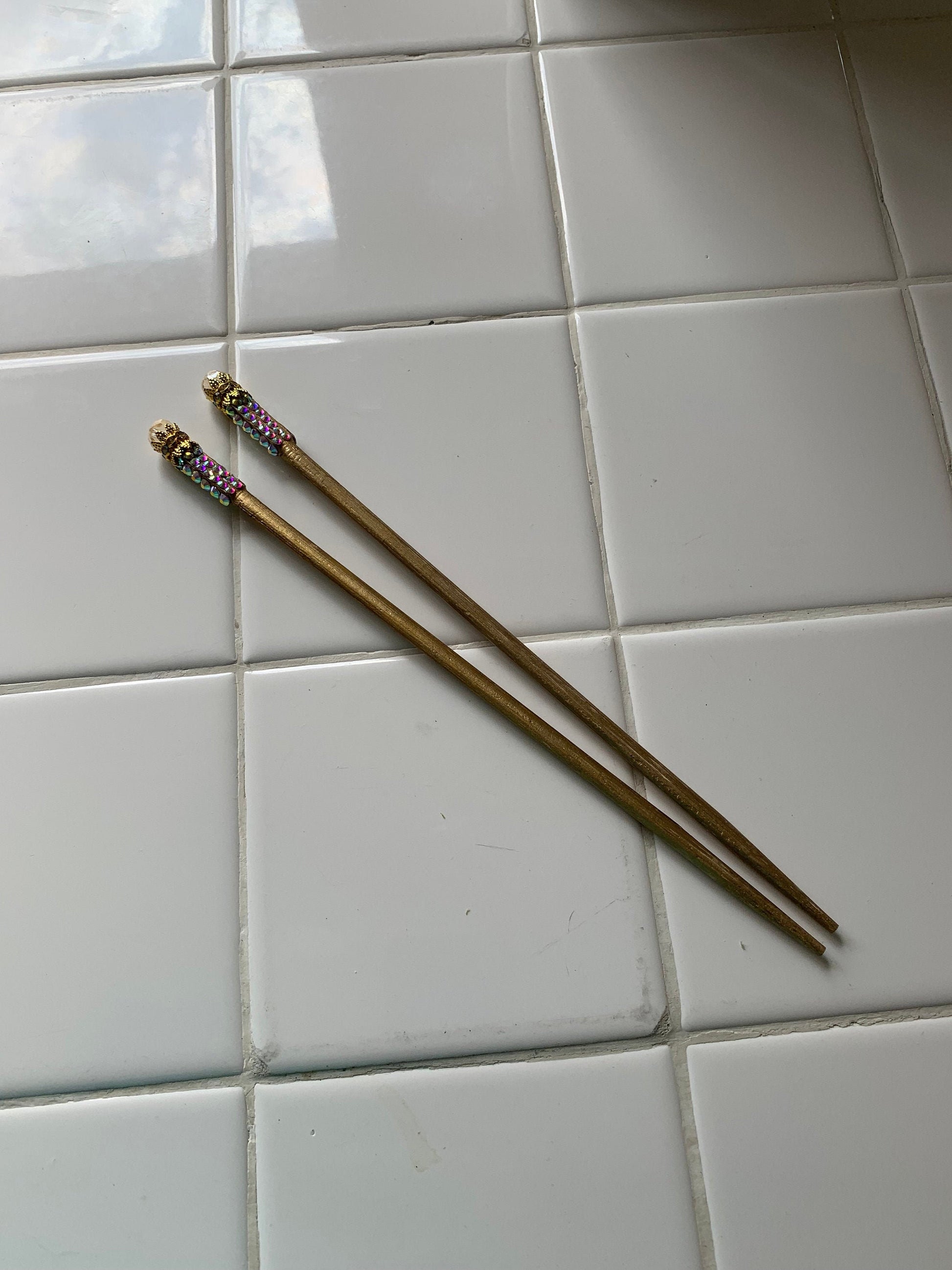 This is a pair of hair chopsticks. These hair accessories can be worn in a variety of oils. With a bun. With any up to. Adds a beautiful touch to your hairstyle. Approximately 9 1/2 inches long.