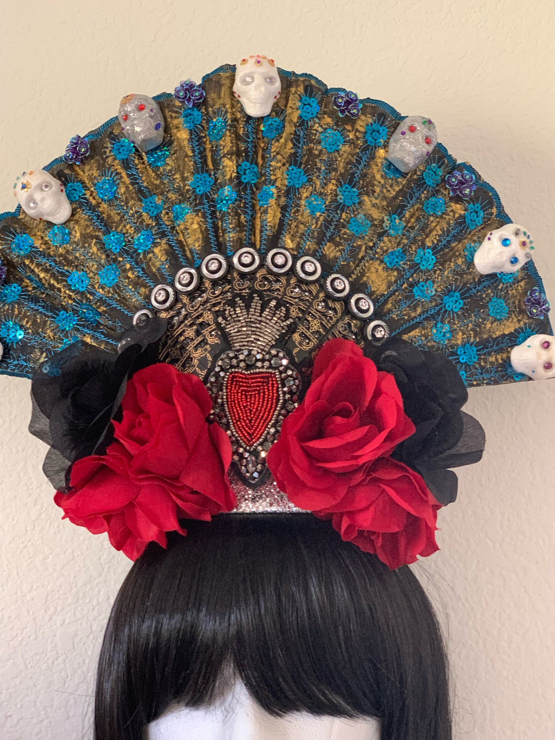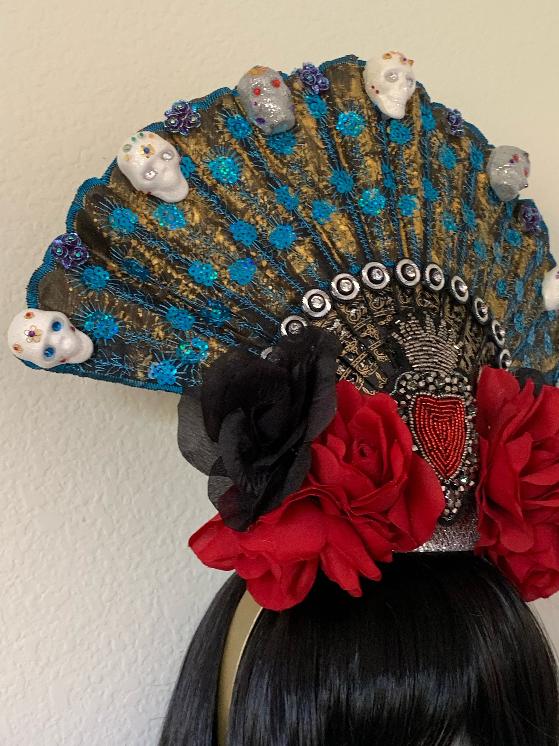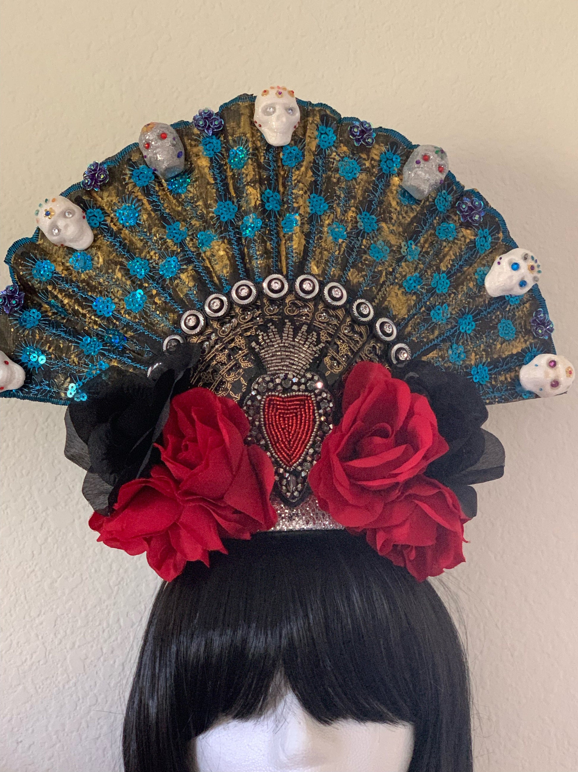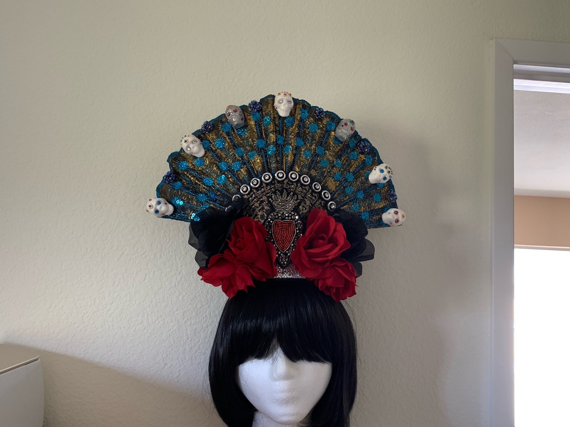 Day of the Dead Head piece, Dia De Los Muertos Crown It is place on with a head band. Please note, this is a bit heavy and may need to be secured with bobbie pins. The base is made of heavy craft foam. Fan base with skulls and flowers and a lot of bling. A great additions to any costume of cosplay. One of a kind. I will not be making one exactly like this.