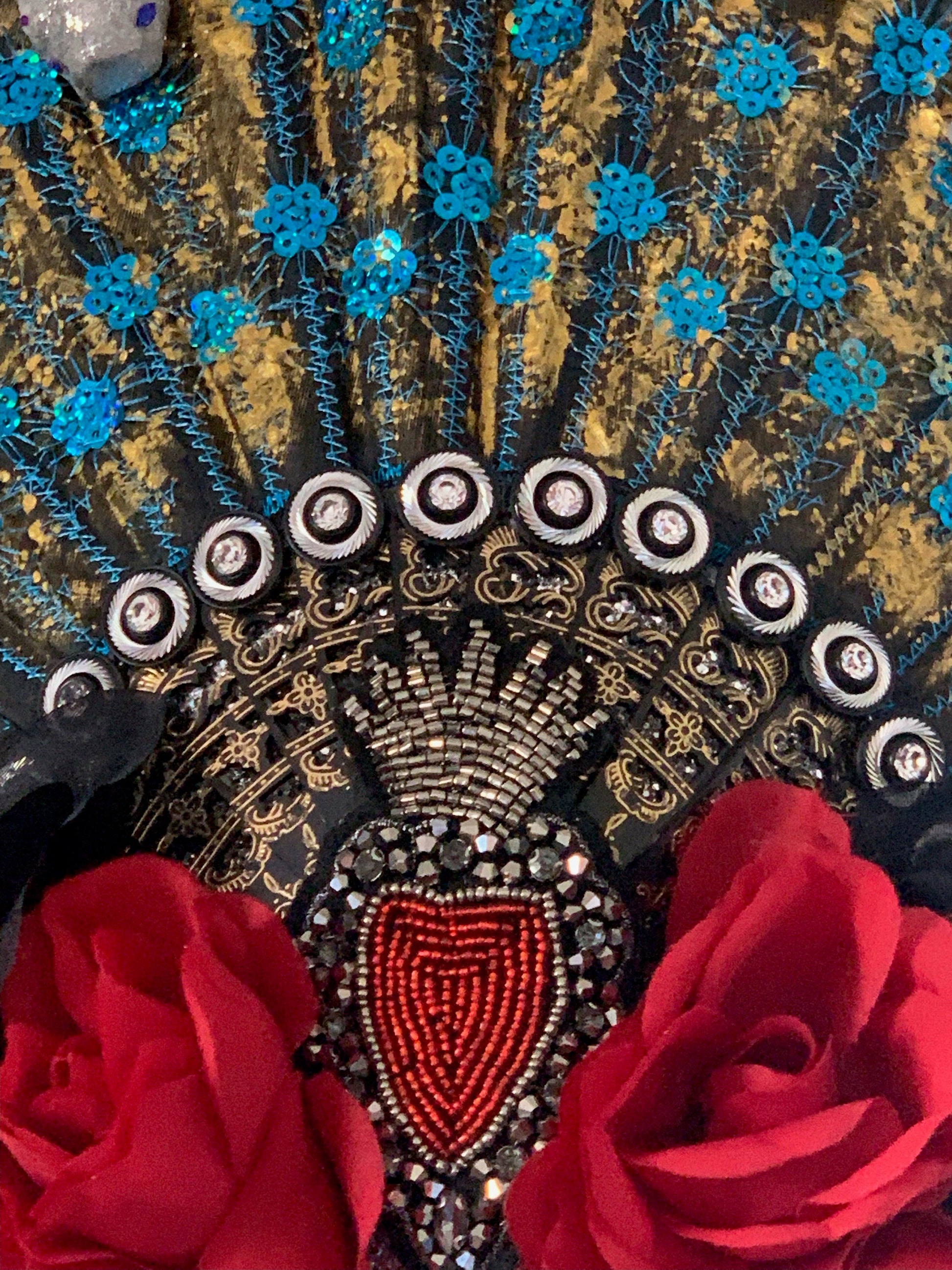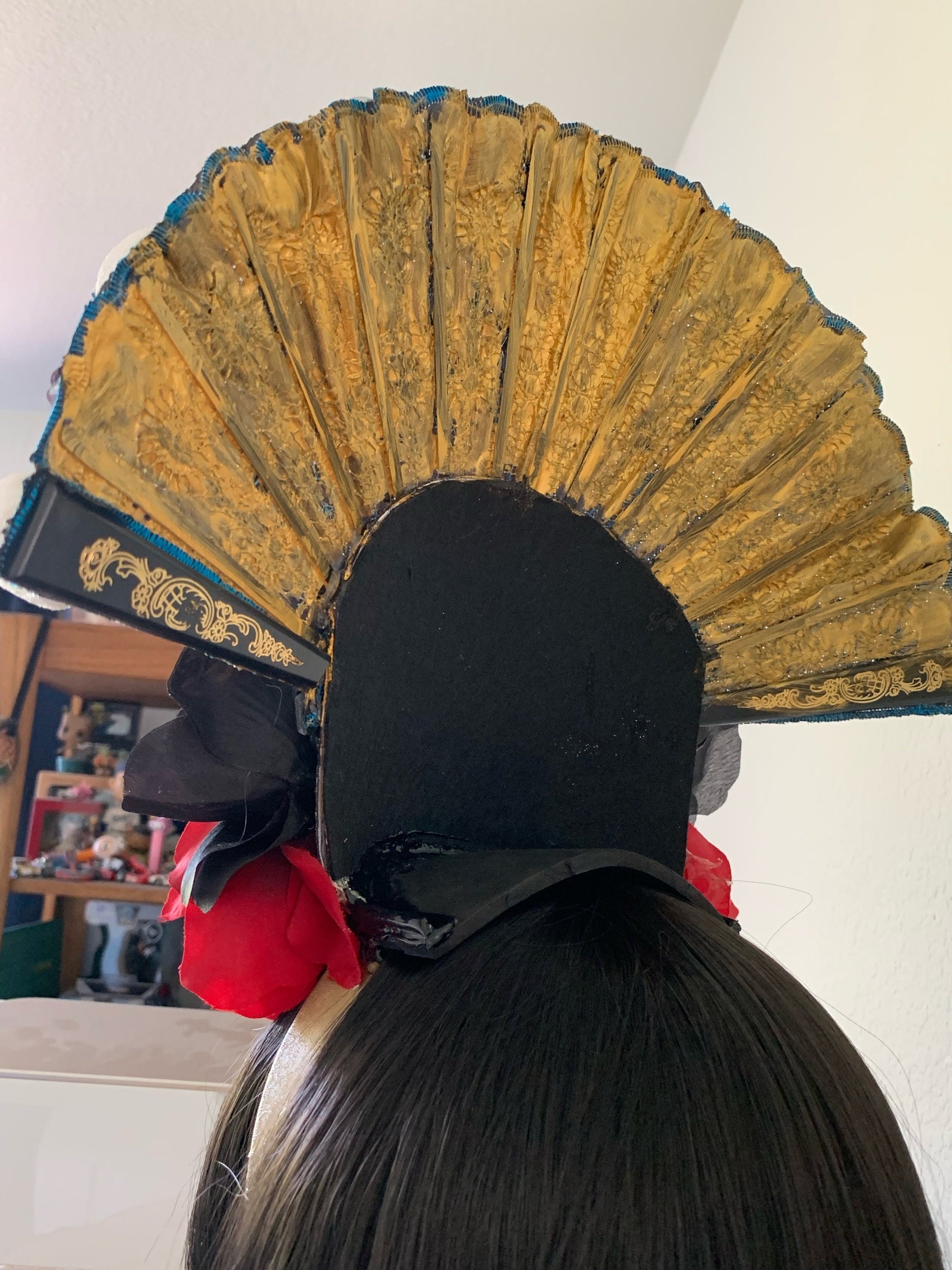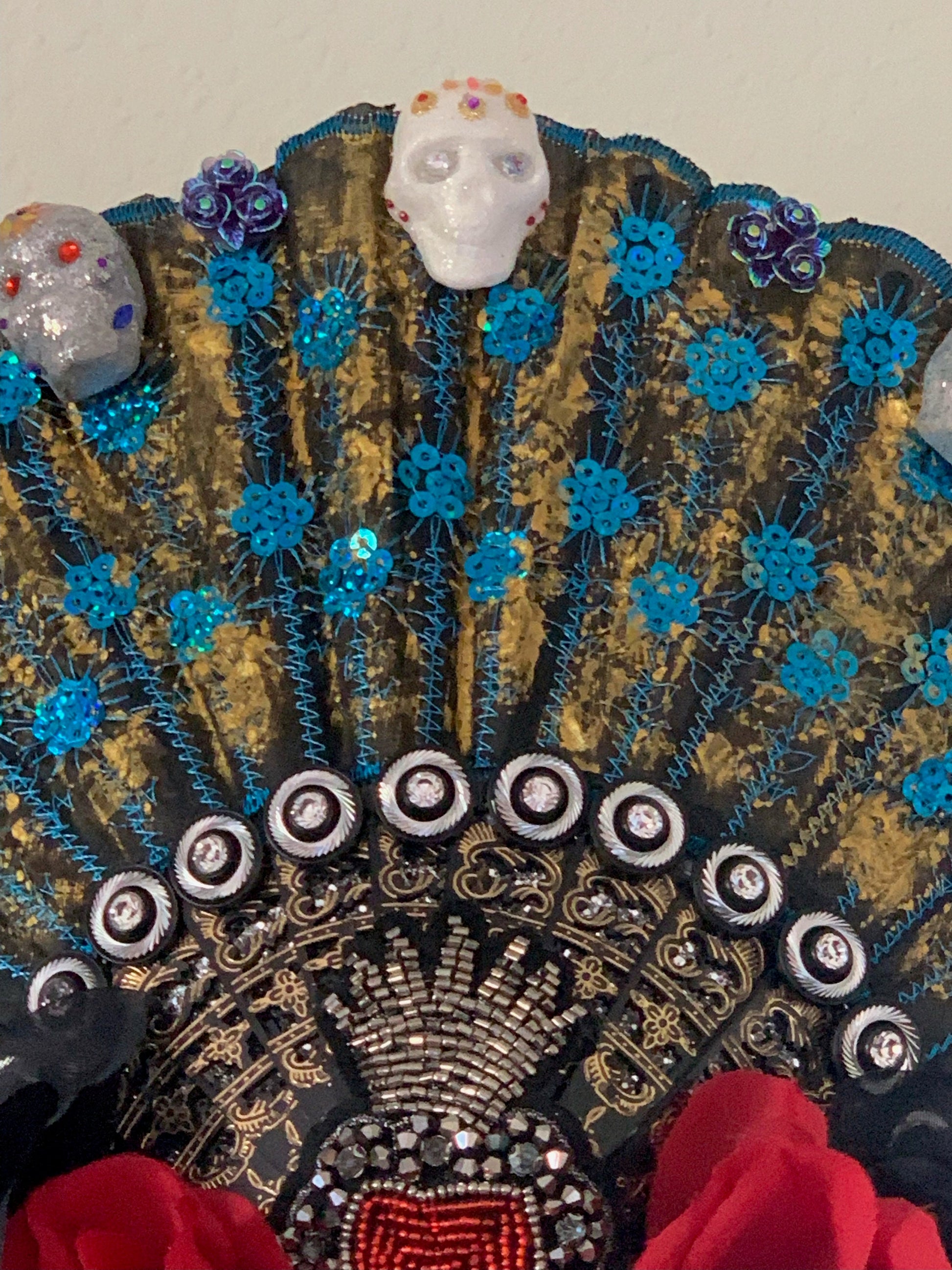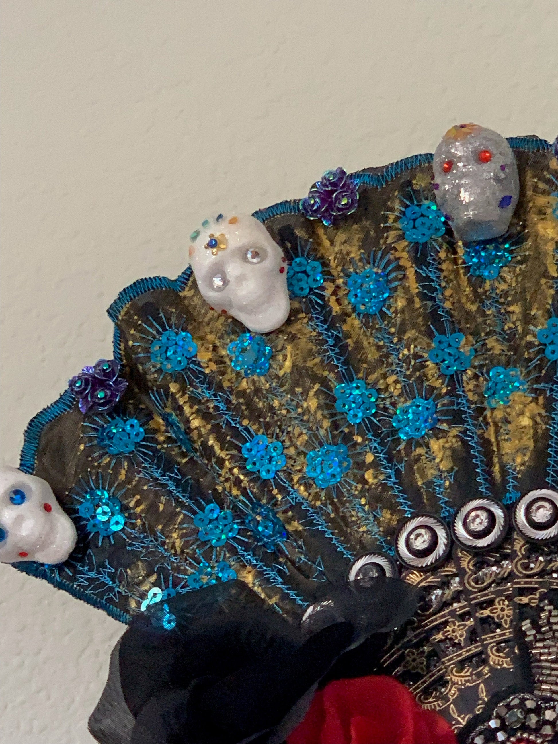 Day of the Dead Head piece, Dia De Los Muertos Crown It is place on with a head band. Please note, this is a bit heavy and may need to be secured with bobbie pins. The base is made of heavy craft foam. Fan base with skulls and flowers and a lot of bling. A great additions to any costume of cosplay. One of a kind. I will not be making one exactly like this.