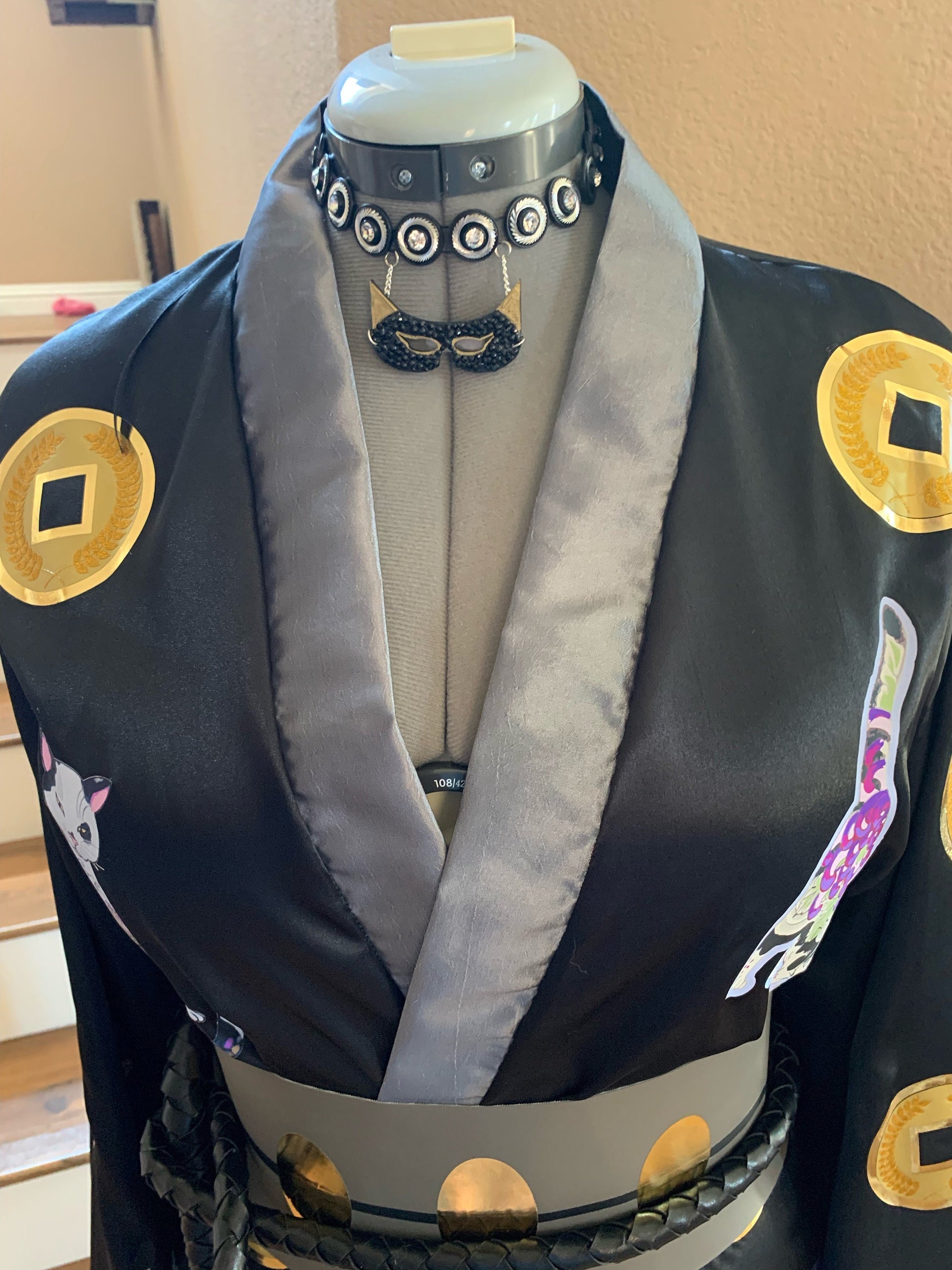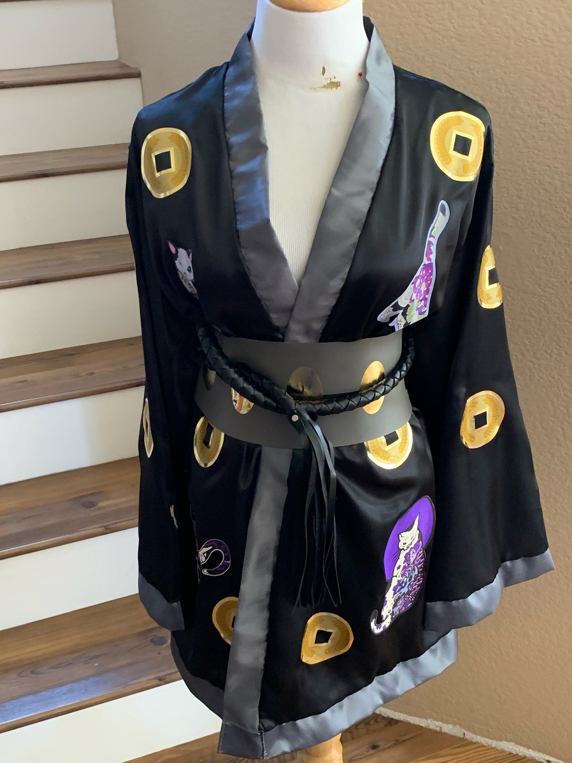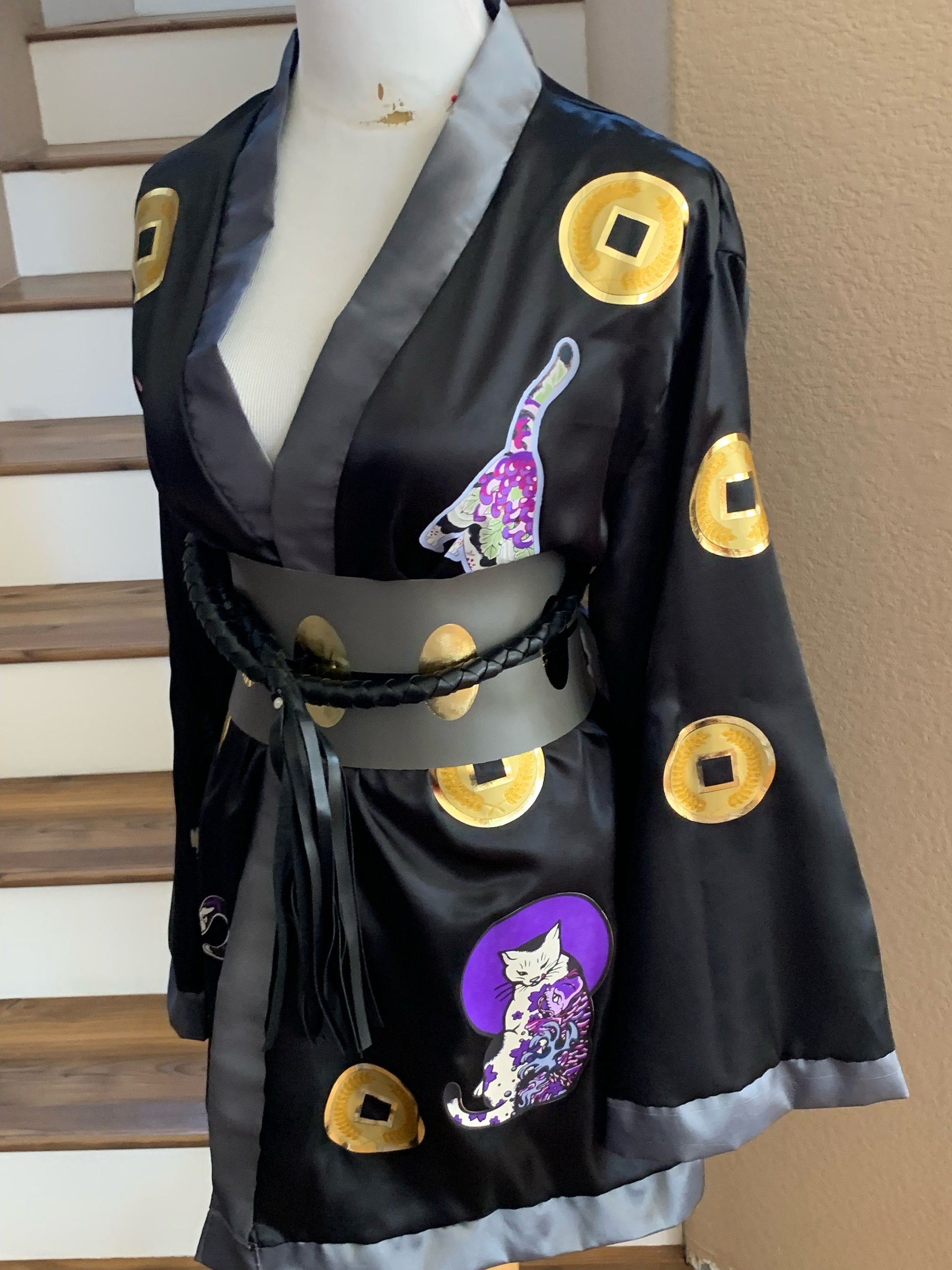 Geisha Catwomen, BlackCat, Woman’s Costume. Included the cover up and belt only! Wig and necklace can be purchased separately on my Etsy! With is a Robe so it is one size fit most S- L It will not fit extra large. The robe is on the short side. This is Made of satin material. This is a hand wash only garment, This was inspired by the XM Studio Carry' Marthin Agusta Sculpture. IT would be great for Halloween, Cosplay or even at a renisasance fair! This is a one of a king made for a photo shoot that did not happen because of covid. Included in the line is Harley Quinn, Poison Ivy and Black Canary.