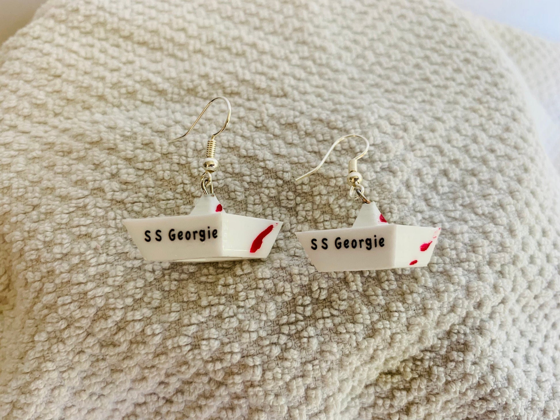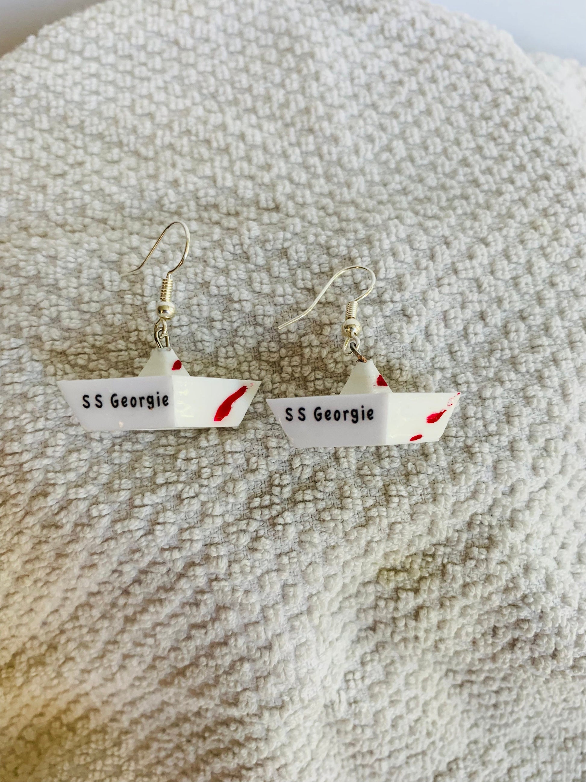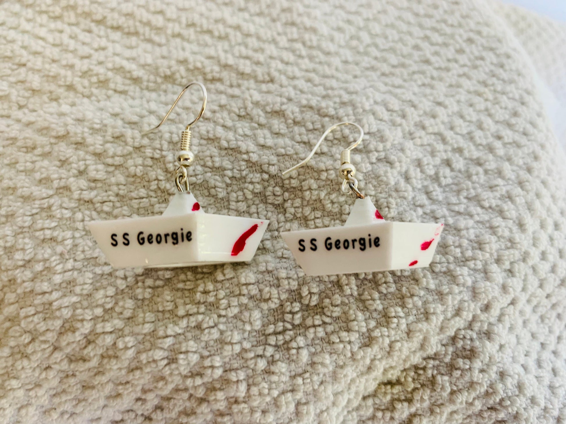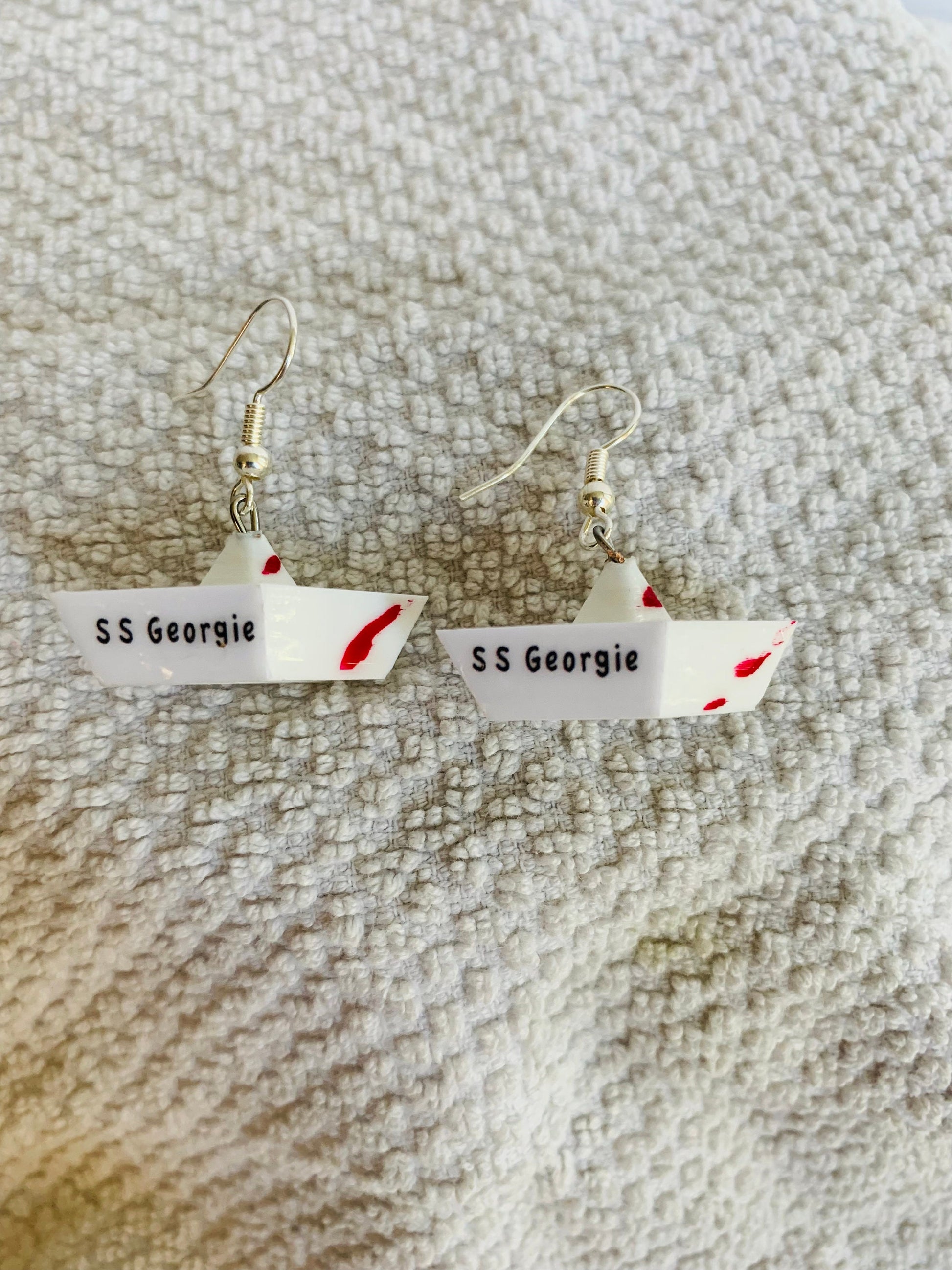 Pennywise inspired earrings. Inspired by IT, USS Georgie’s paper boat. 3D printed earrings with a resin overlay.