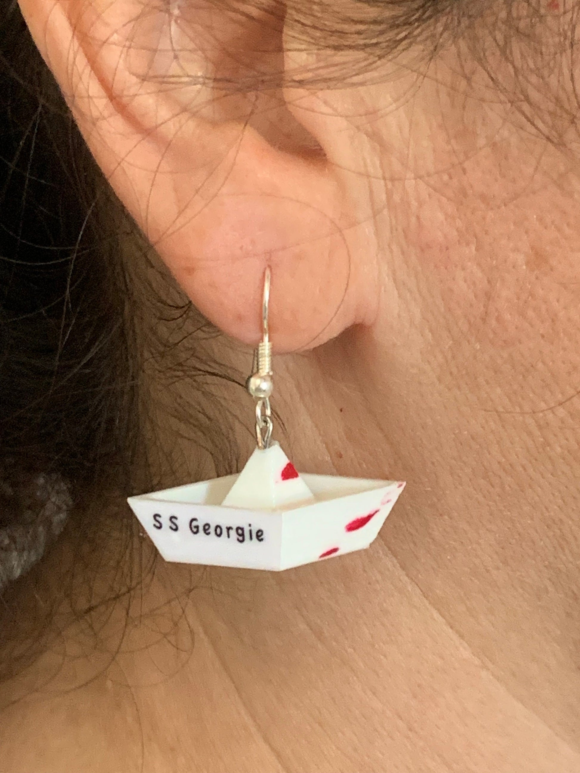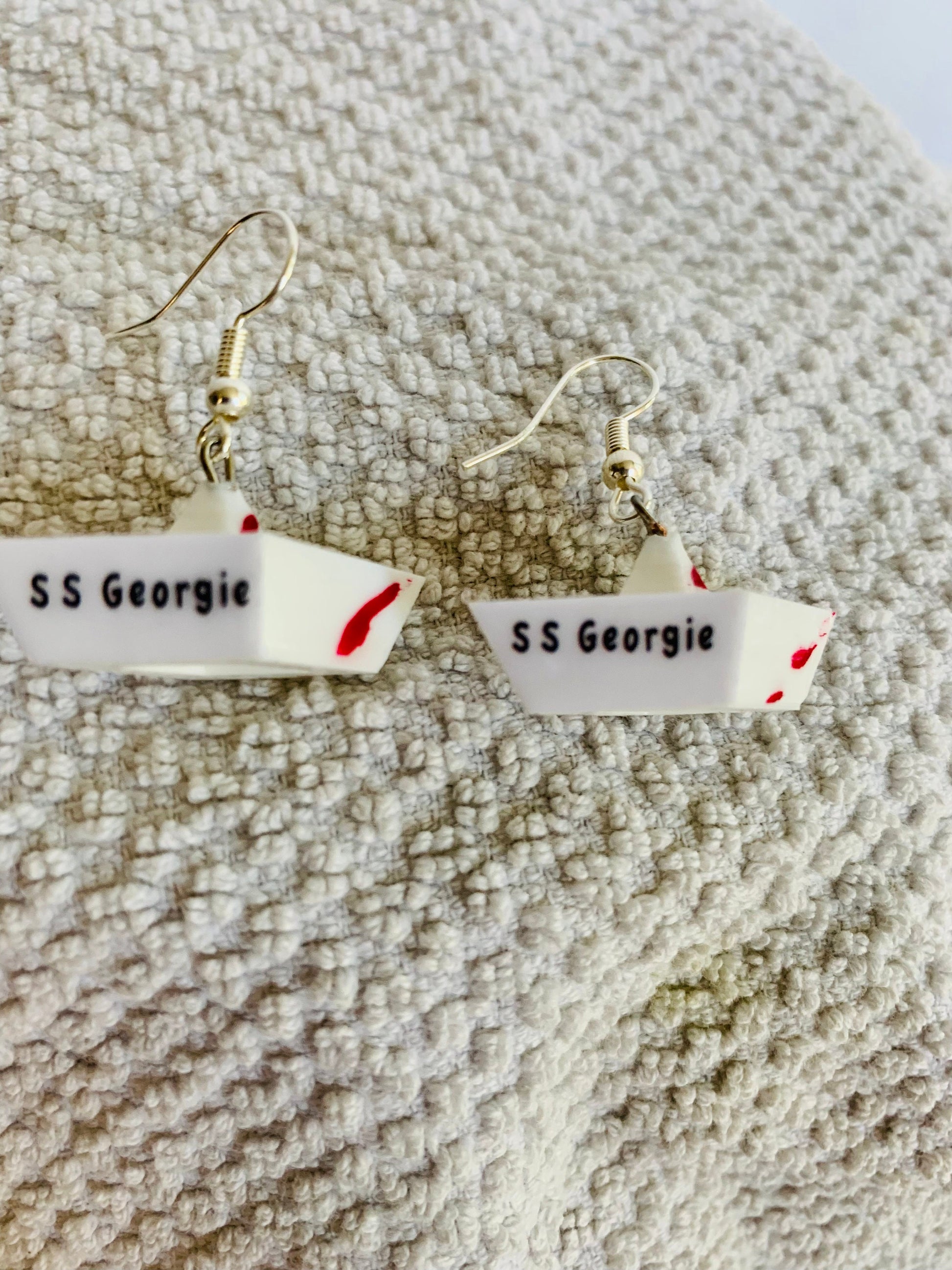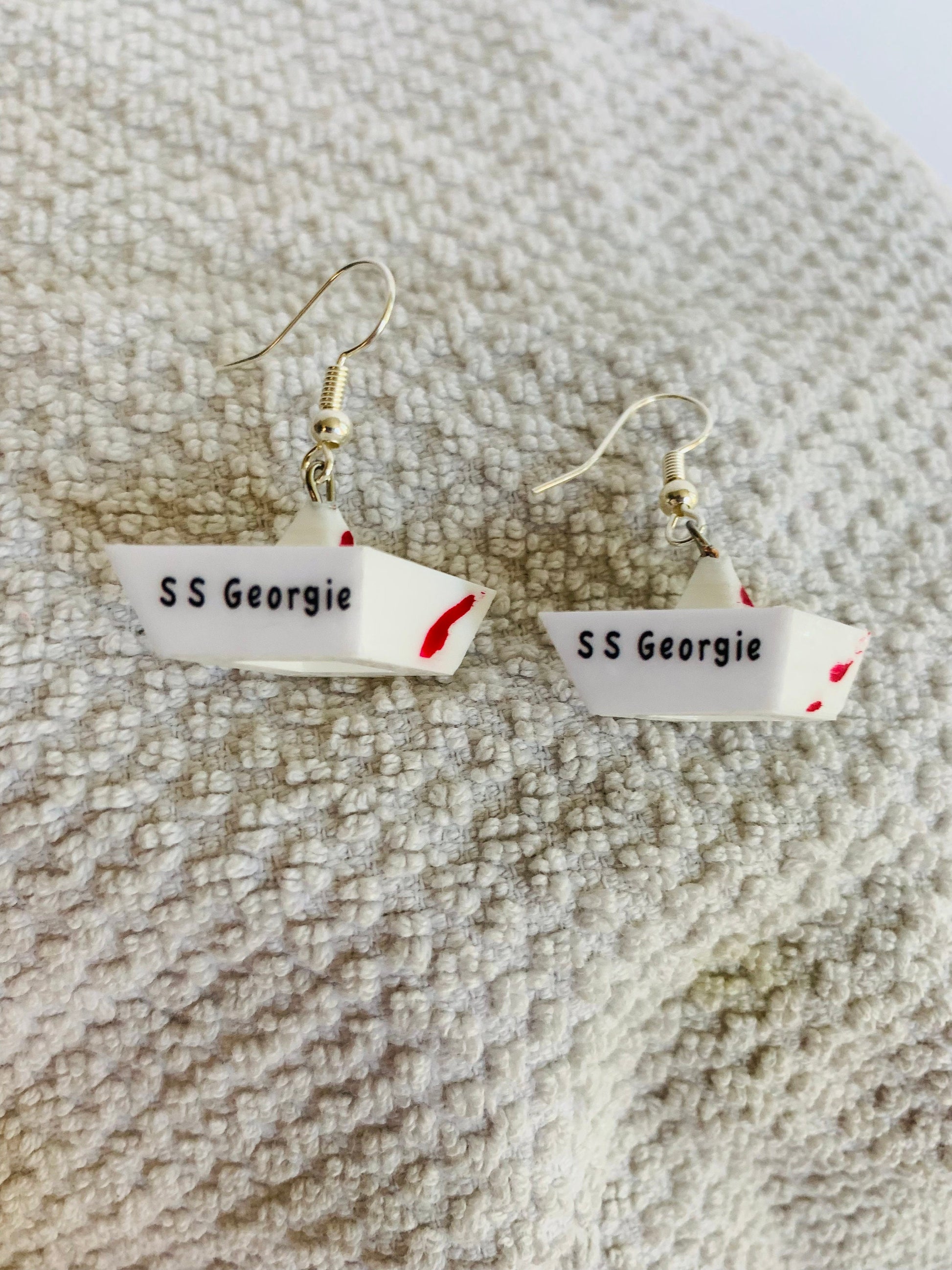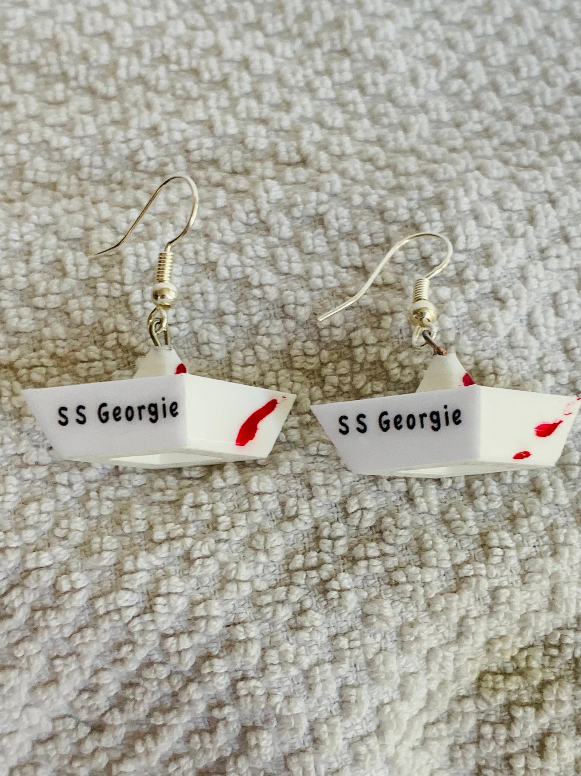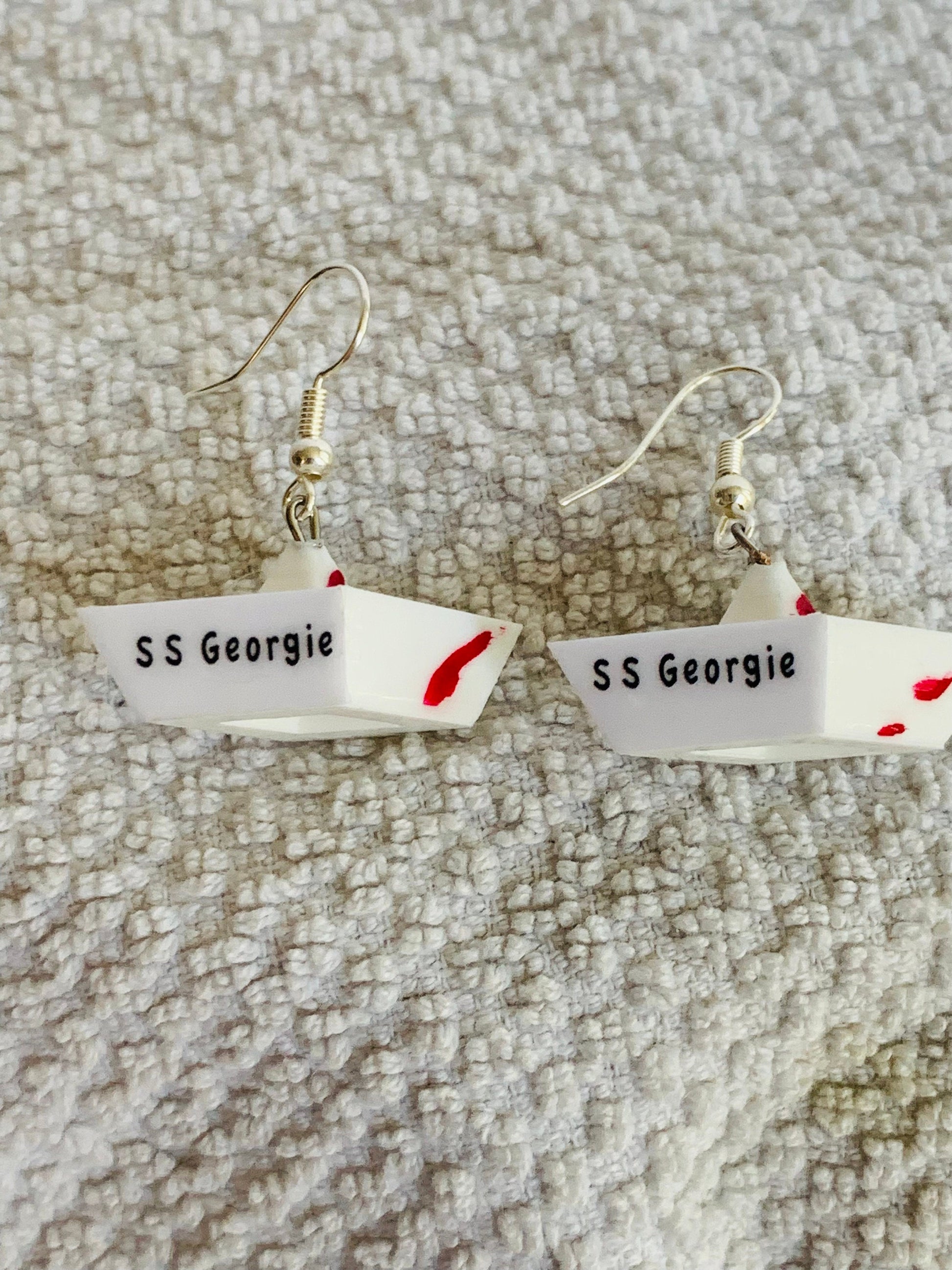 Pennywise inspired earrings. Inspired by IT, USS Georgie’s paper boat. 3D printed earrings with a resin overlay.