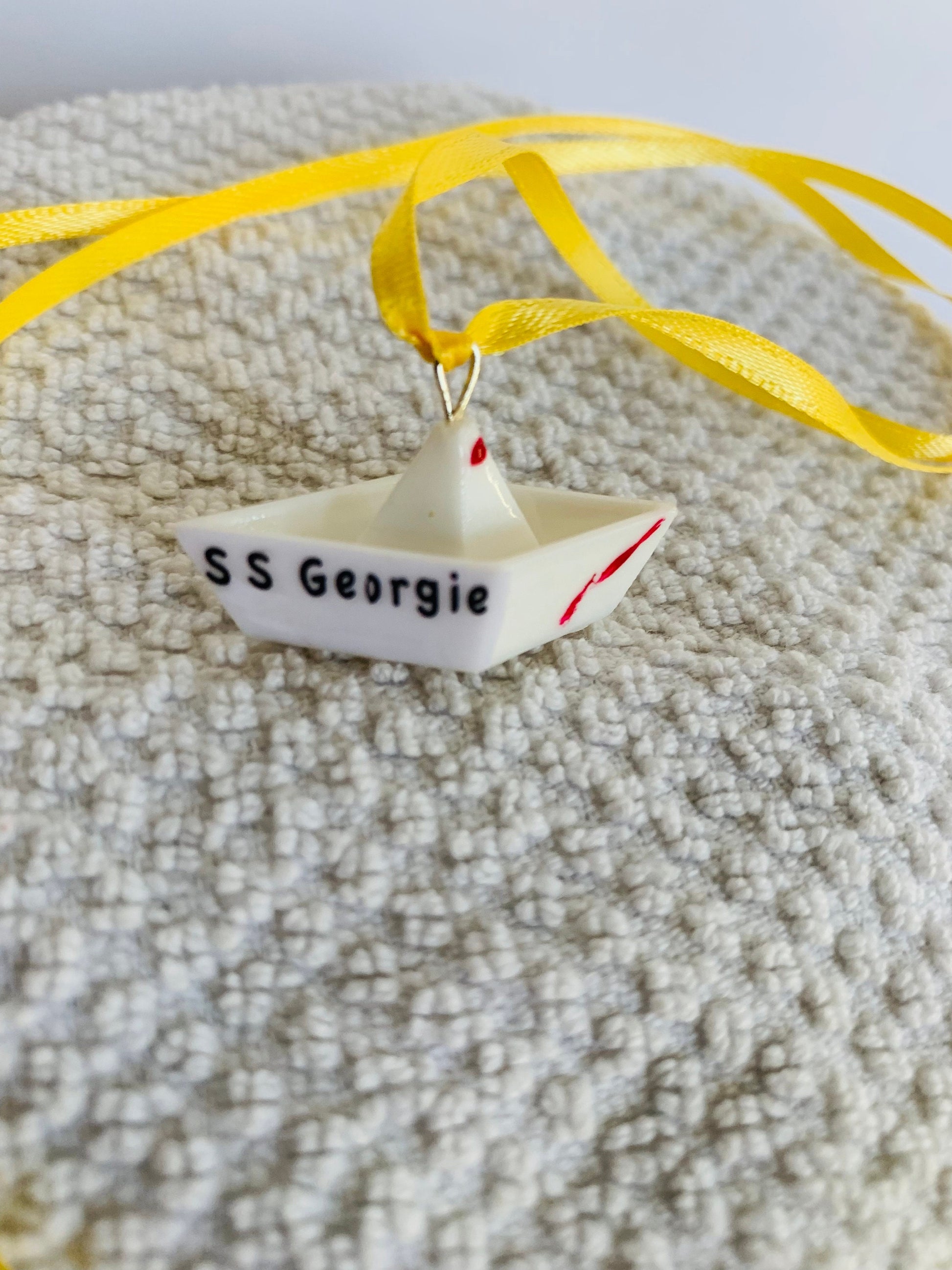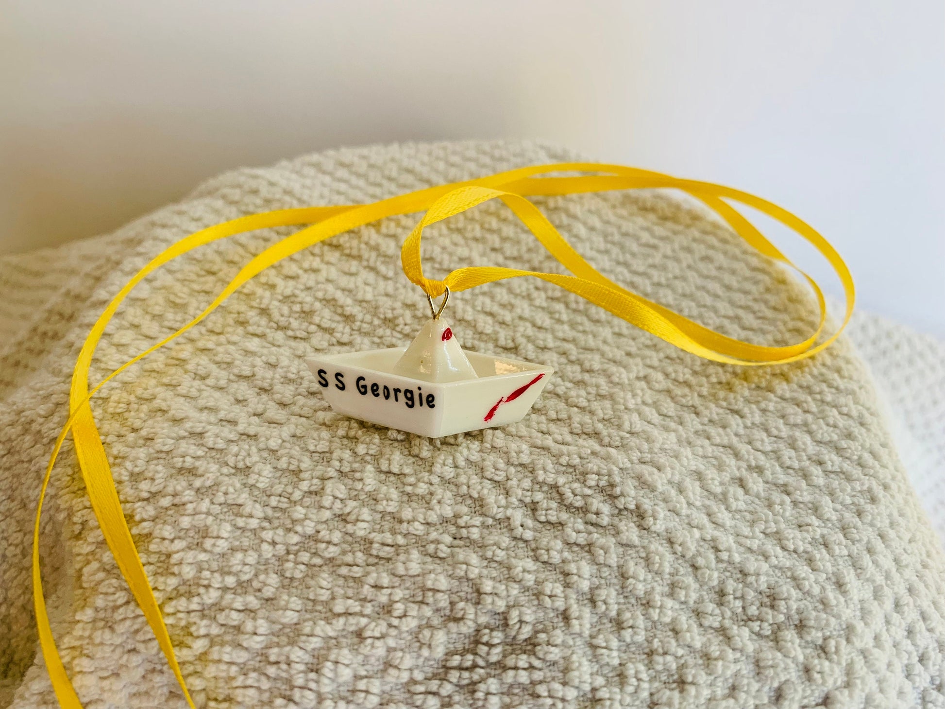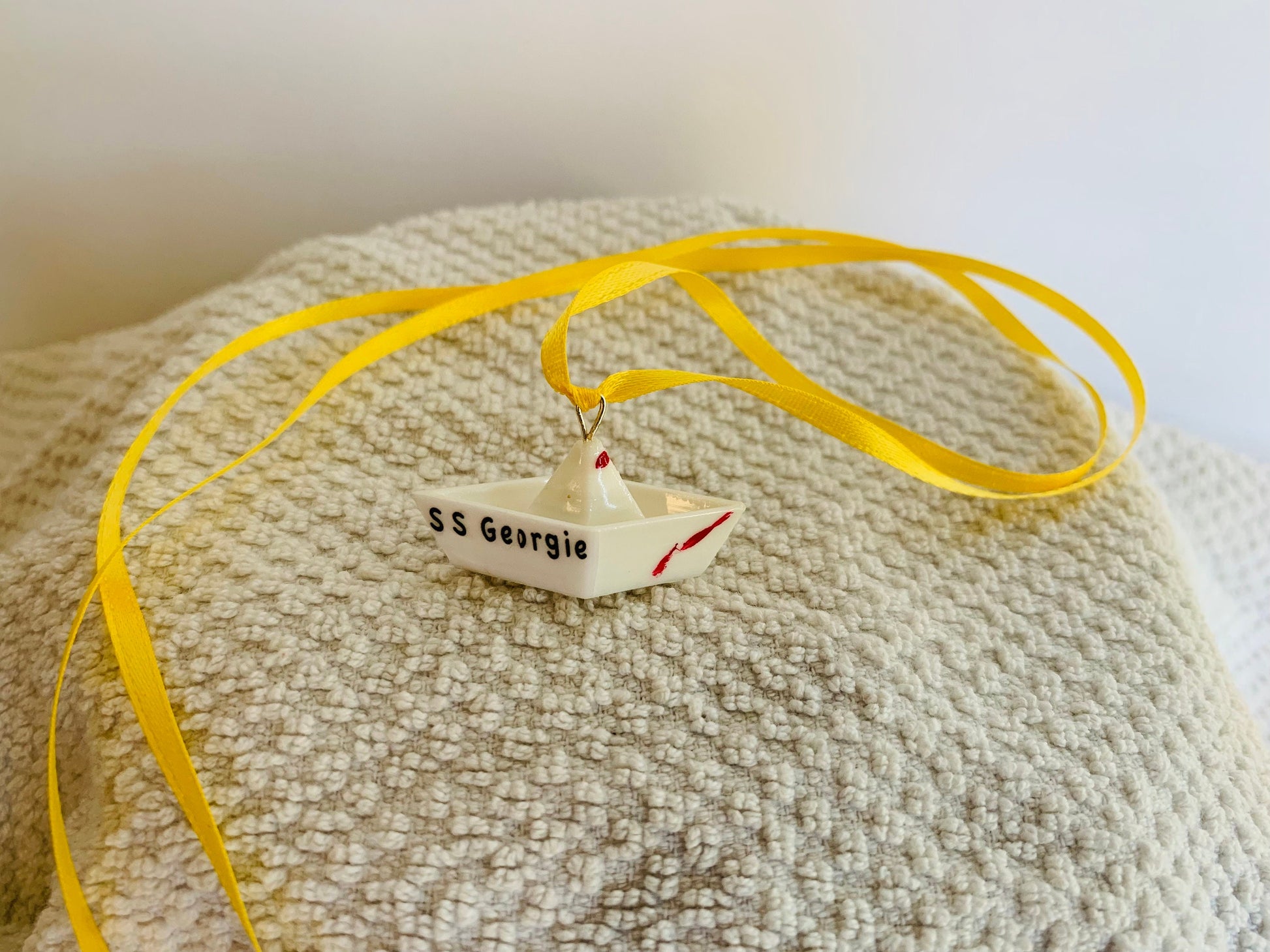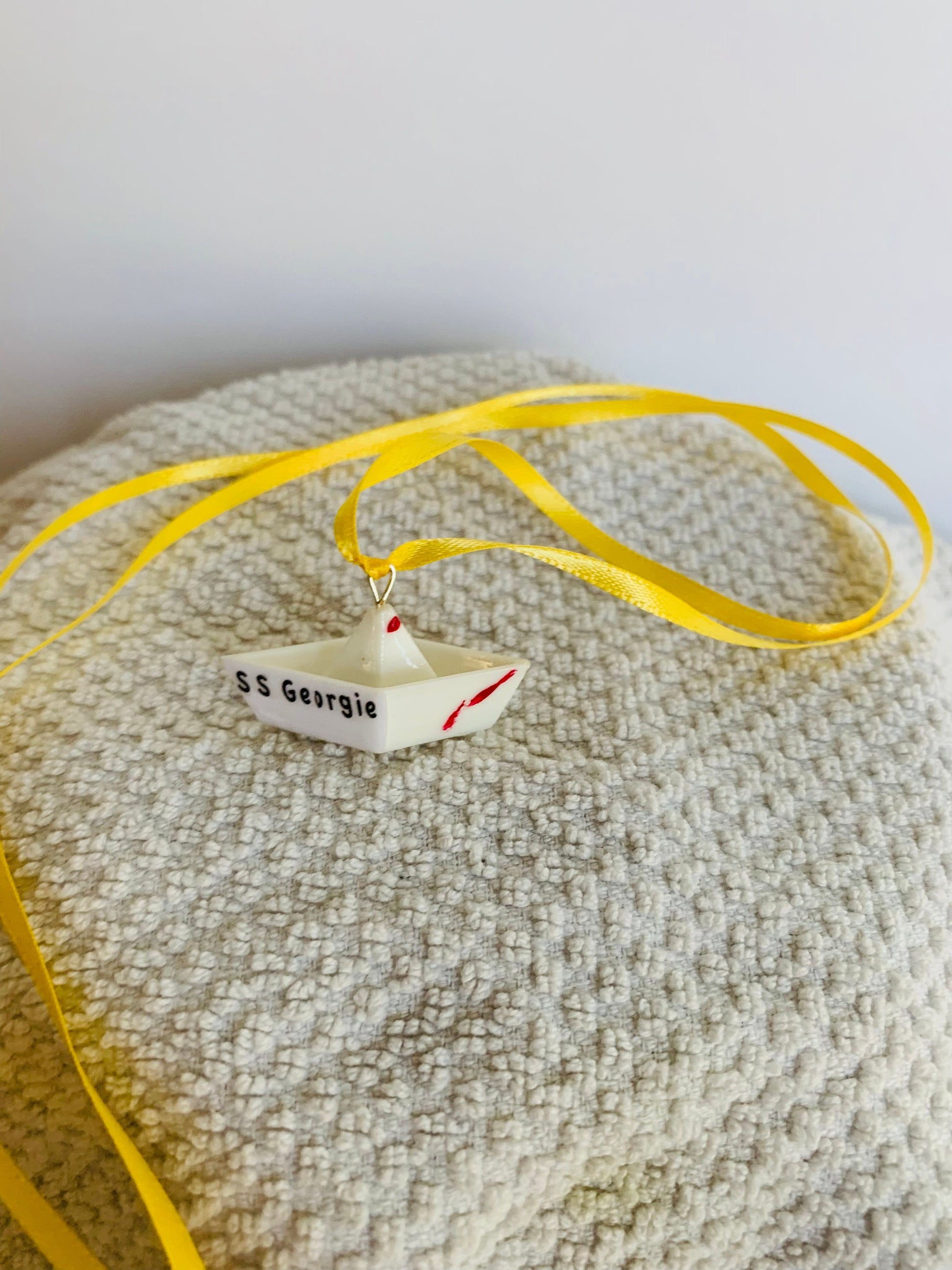 Pennywise inspired necklace. Inspired by IT, USS Georgie’s paper boat. 3D printed earrings with a resin overlay. Yellow ribbon to tie the necklace.