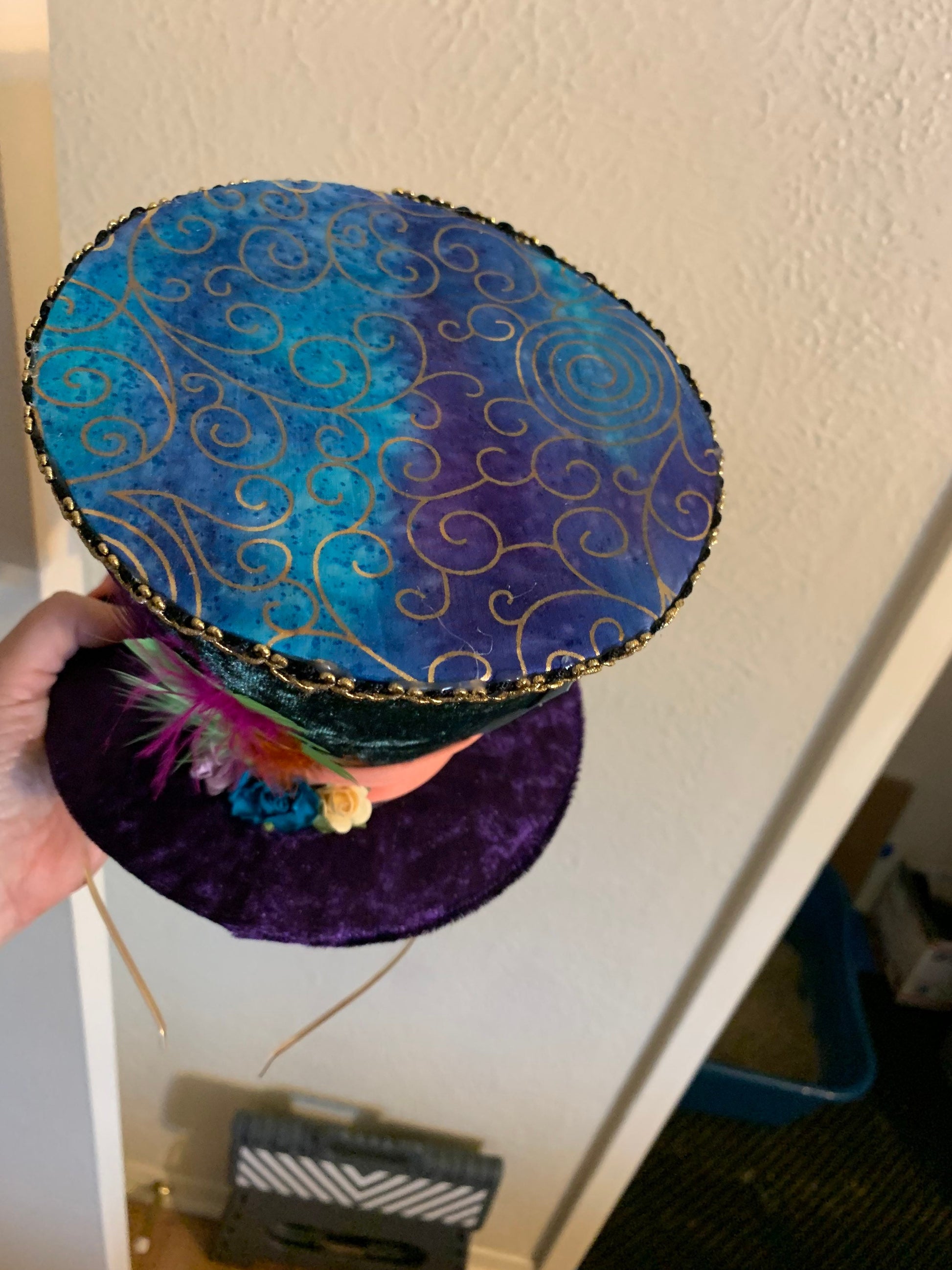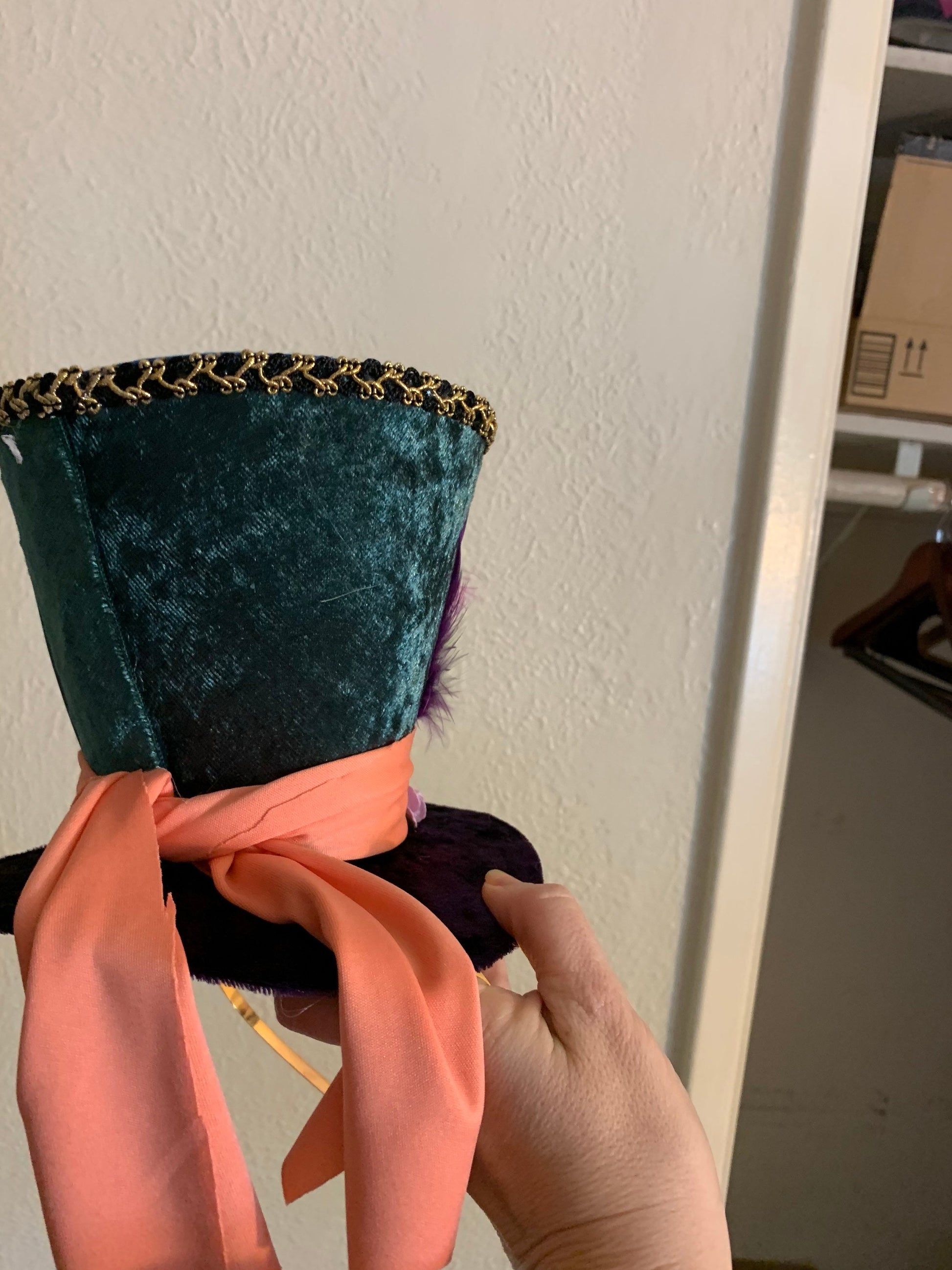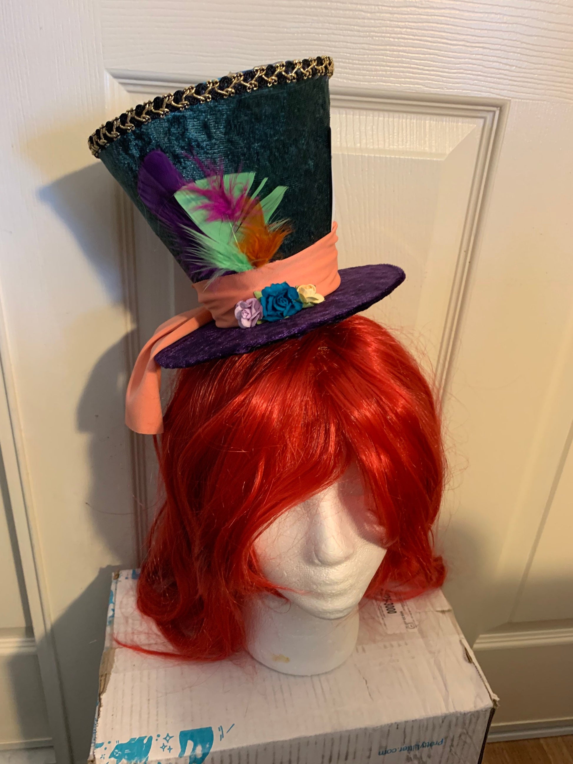 This is a Mini Mad Hatter Hat. It approx. measures 5" High and 7" long. It has clips to secure to you head. A great addition to any costume or night out on the town. Note due to supplies restraints the top fabric, trim, flower and feathers may very in color.