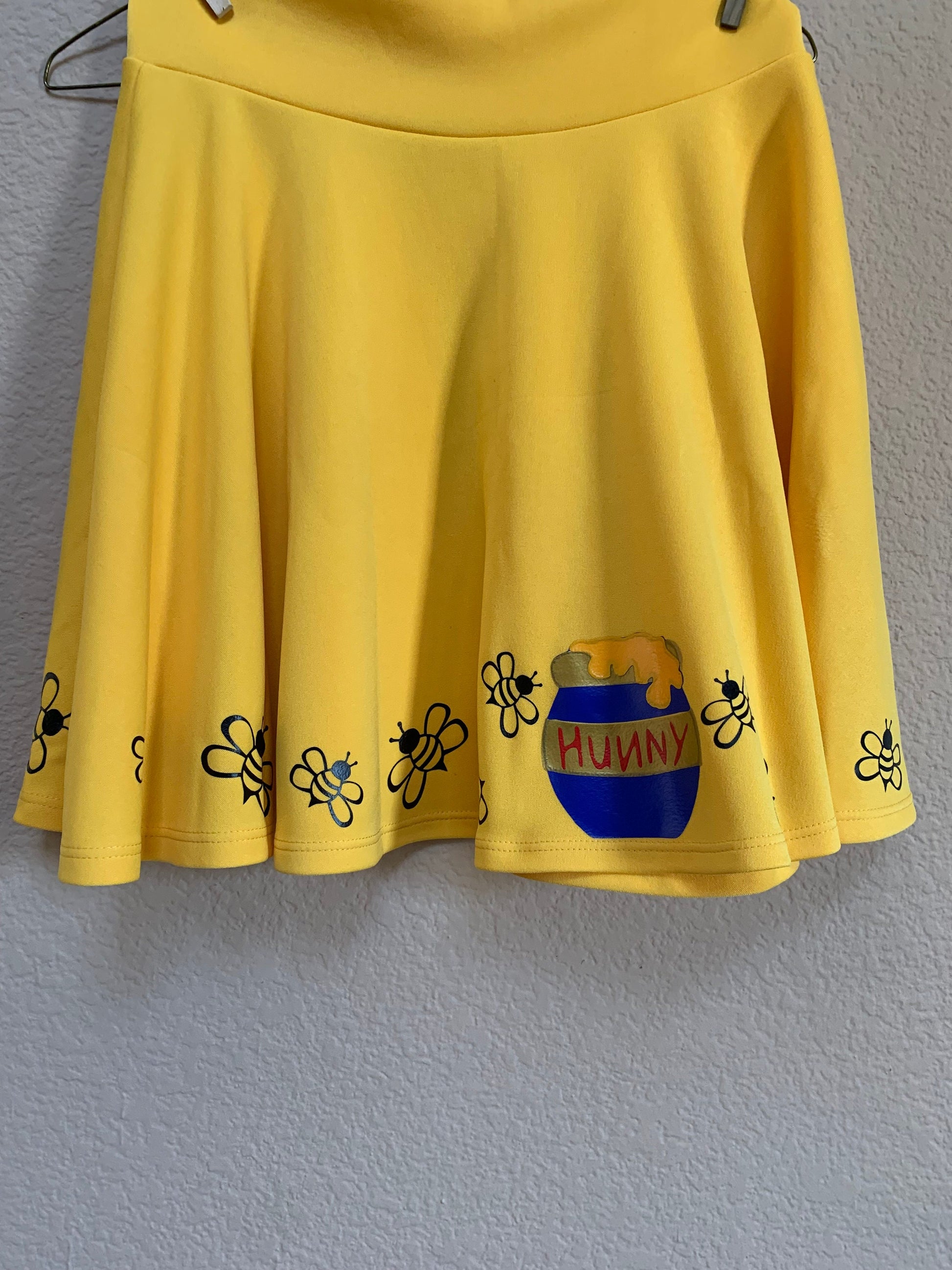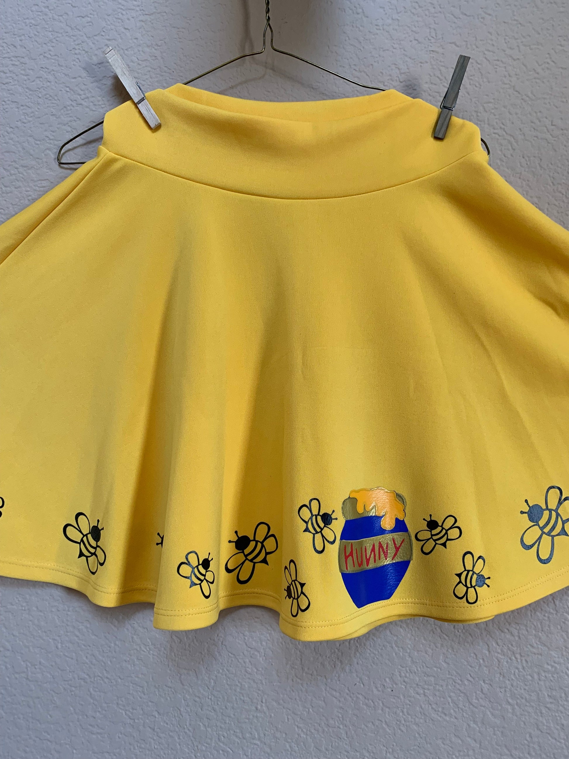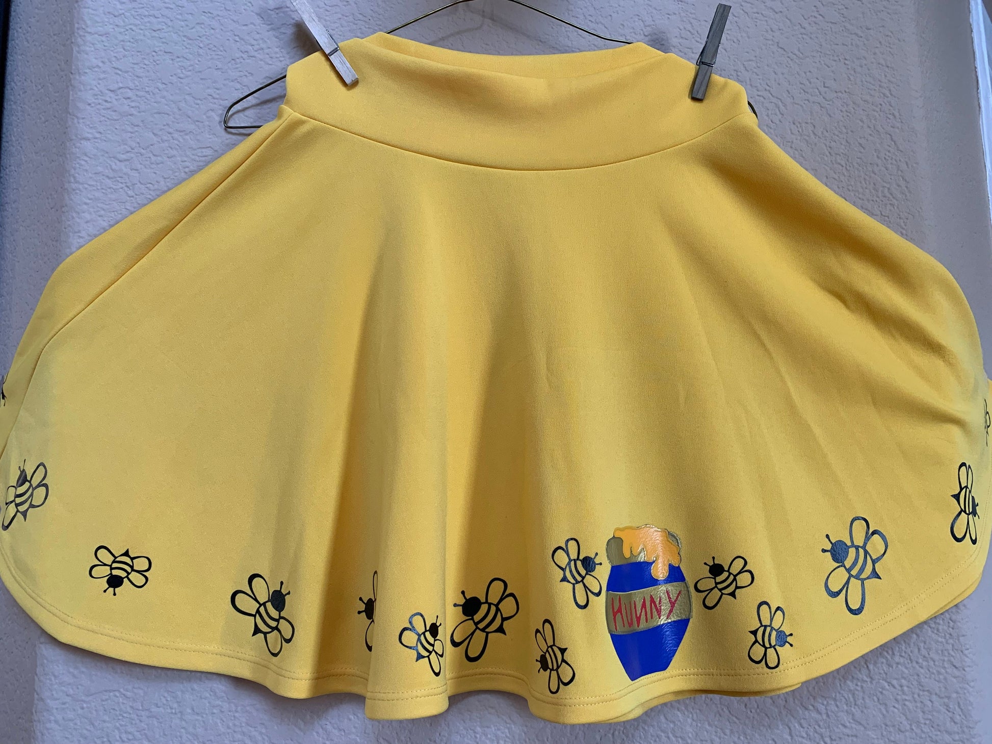 This is a Winnie the Pooh inspired Skate skirt. I stock size medium. For small or larger sizes please allow a longer wait time! Honey pot design with bees all around the bottom. The skirt is a mustard yellow. There is a bit of a difference of the lighting of the pictures. Please see size chart in pictures! Please don't hesitate to ask questions I what the item to fit and for you to be happy!