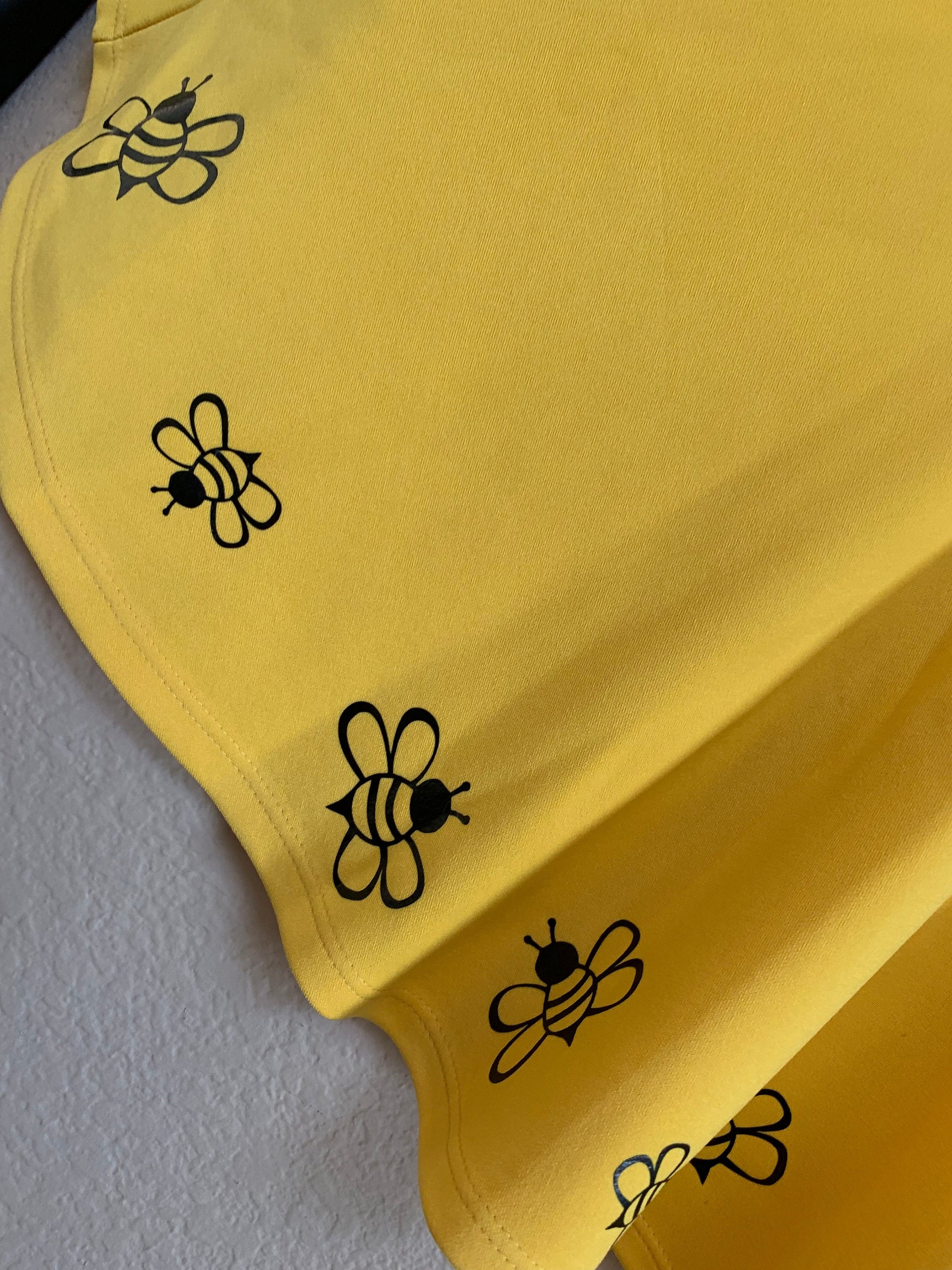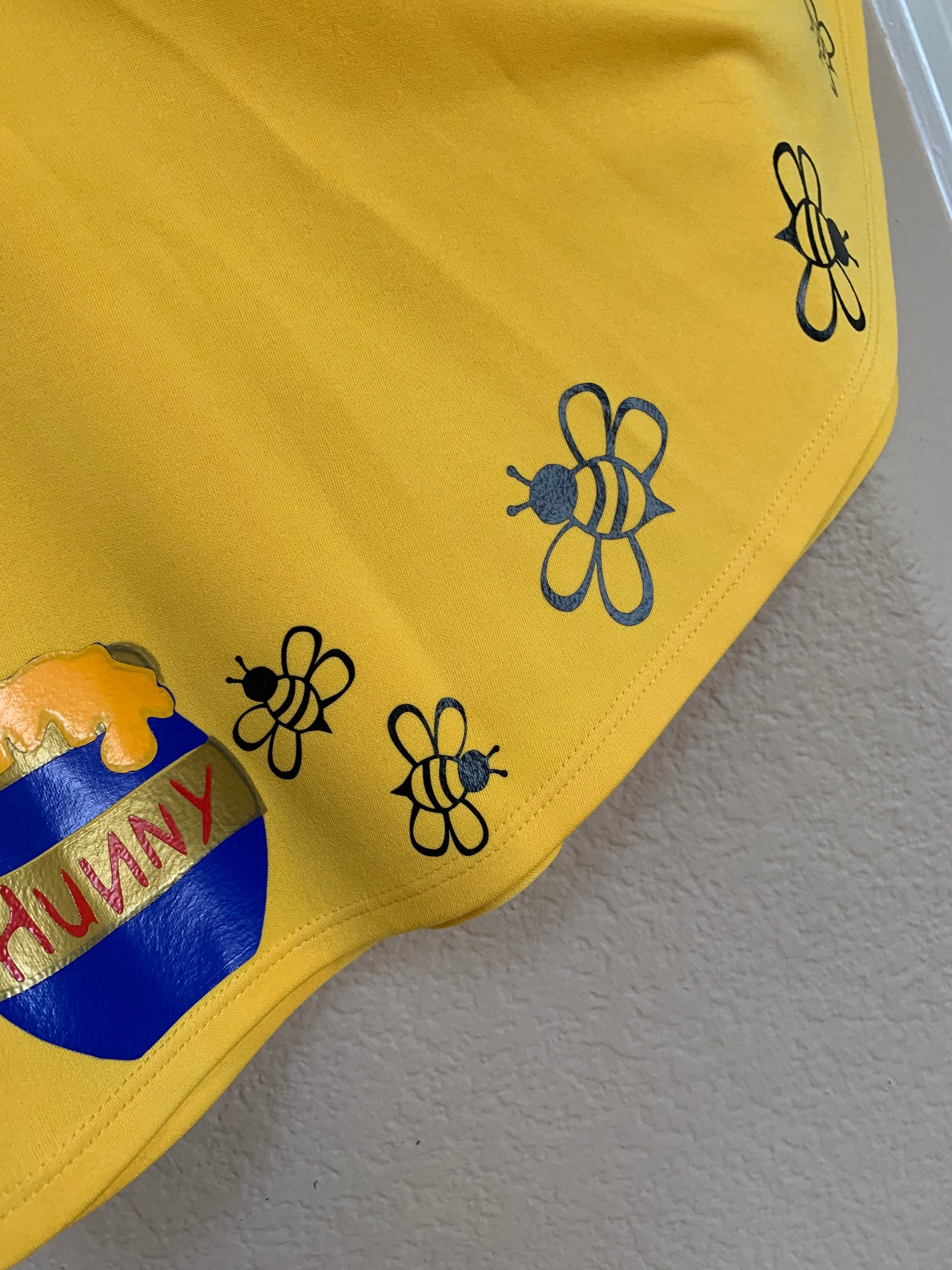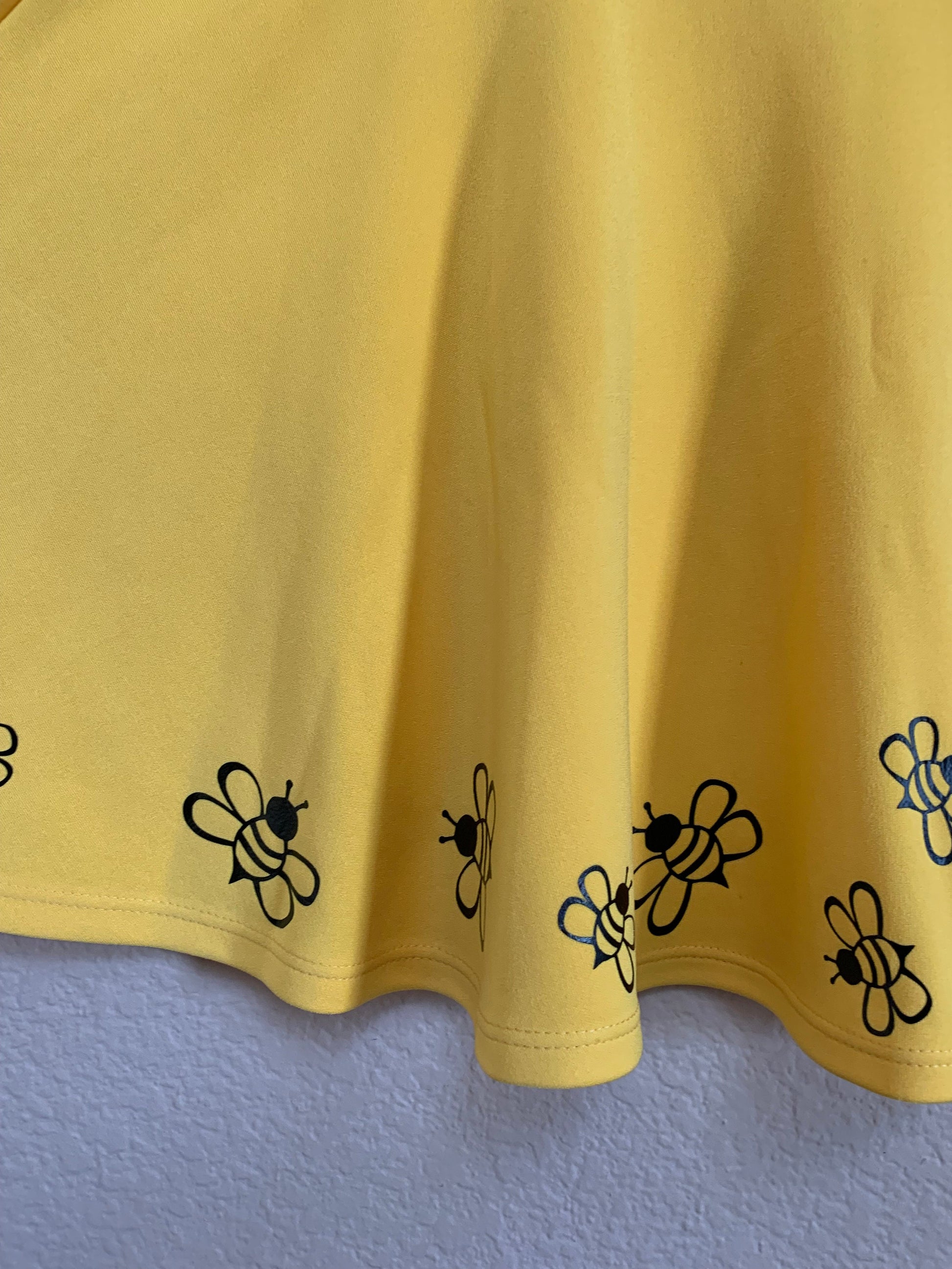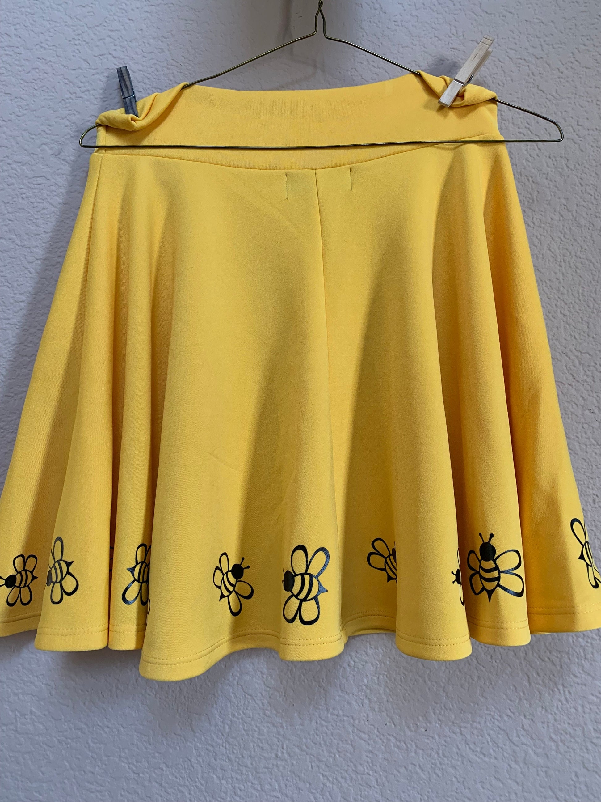 This is a Winnie the Pooh inspired Skate skirt. I stock size medium. For small or larger sizes please allow a longer wait time! Honey pot design with bees all around the bottom. The skirt is a mustard yellow. There is a bit of a difference of the lighting of the pictures. Please see size chart in pictures! Please don't hesitate to ask questions I what the item to fit and for you to be happy!